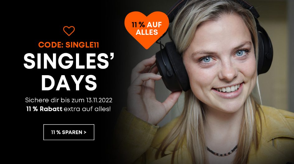 Besonders attraktiv soll die Aktion vor allem dadurch werden, dass der 11 % Preisnachlass zusätzlich auf bereits reduzierte Preise gilt. Der Rabatt-Code: SINGLE11 kann ganz unkompliziert im Warenkorb des Onlineshops angewendet werden. Sowohl Studio-Referenzkopfhörer, Mikrofone, Gaming-Headsets und Kopfhörer für den täglichen Gebrauch sind Teil der Aktion.