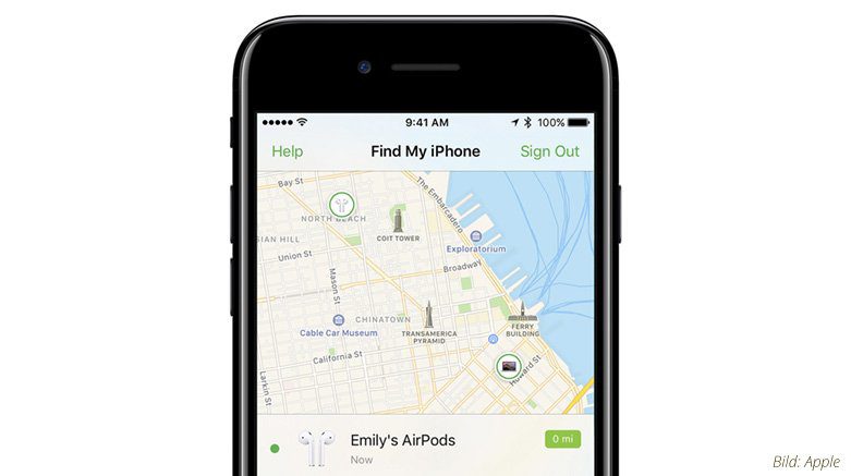 Die AirPods geben entweder zusammen oder getrennt voneinander einen anschwellenden Ton von sich, so dass sie sich im (Bluetooth-)Umkreis finden lassen sollen. Voraussetzung ist allerdings, dass die beiden AirPods-Hörer noch mit einem iOS-Gerät gekoppelt sind. Über die Website iCloud.com soll der User auf einer Karte den letzten Standort ermitteln können, an dem das iPhone oder iPad mit den AirPods Kontakt hatte.