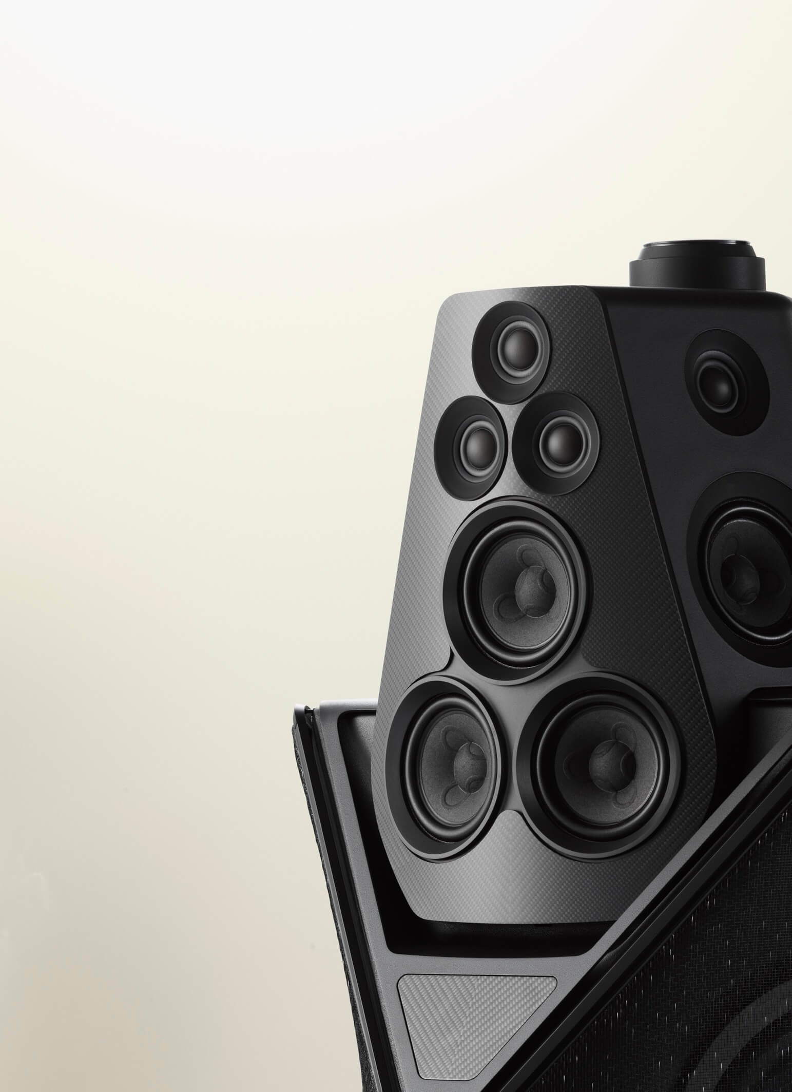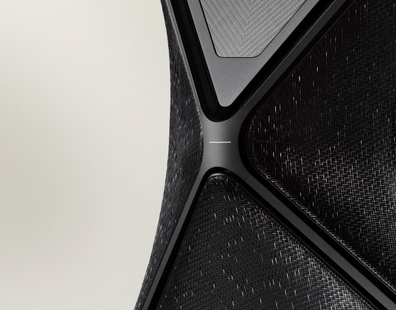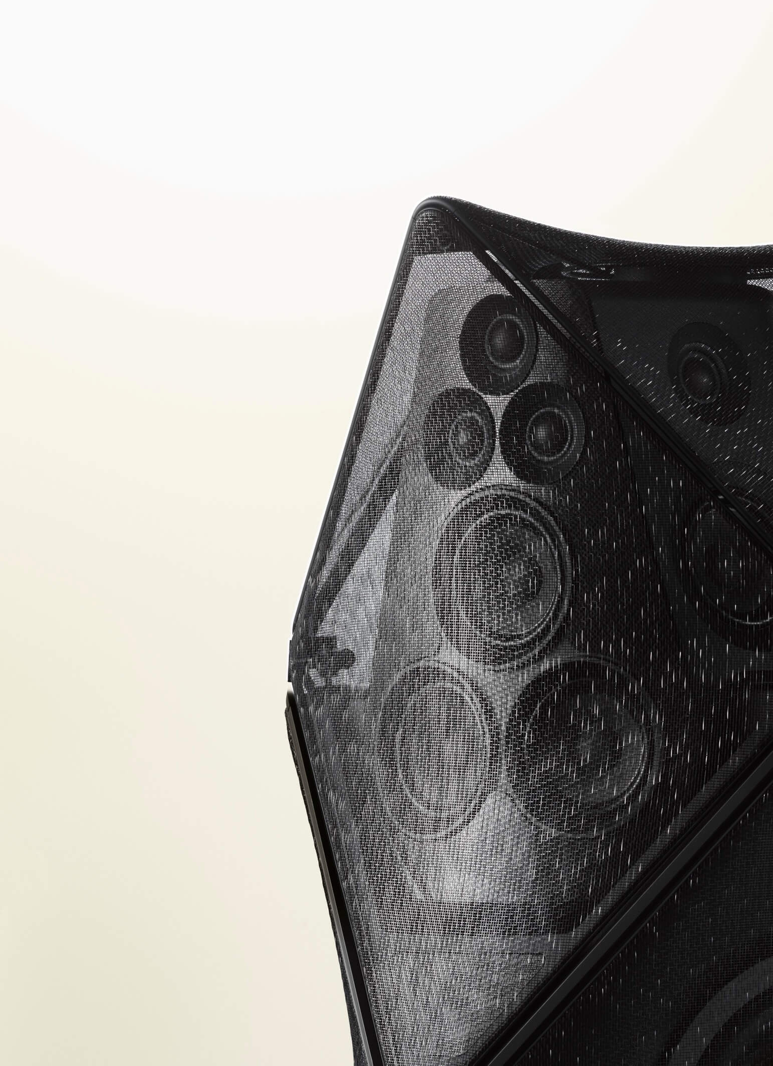 Die Phantom Edition hüllt sich in tiefes Schwarz – eine Hommage an Motorsport-Ästhetik und technische Raffinesse. Halbtransparente PVD-Metallgitter lassen die innere Architektur erahnen und erzeugen je nach Blickwinkel einen holografischen Effekt. Akzente aus handlaminiertem Carbon-Faser-Verbund verleihen der Oberfläche Dynamik und Leichtigkeit, während das perlen-gestrahlte Aluminium-Chassis den Lautsprecher skulptural rahmt.