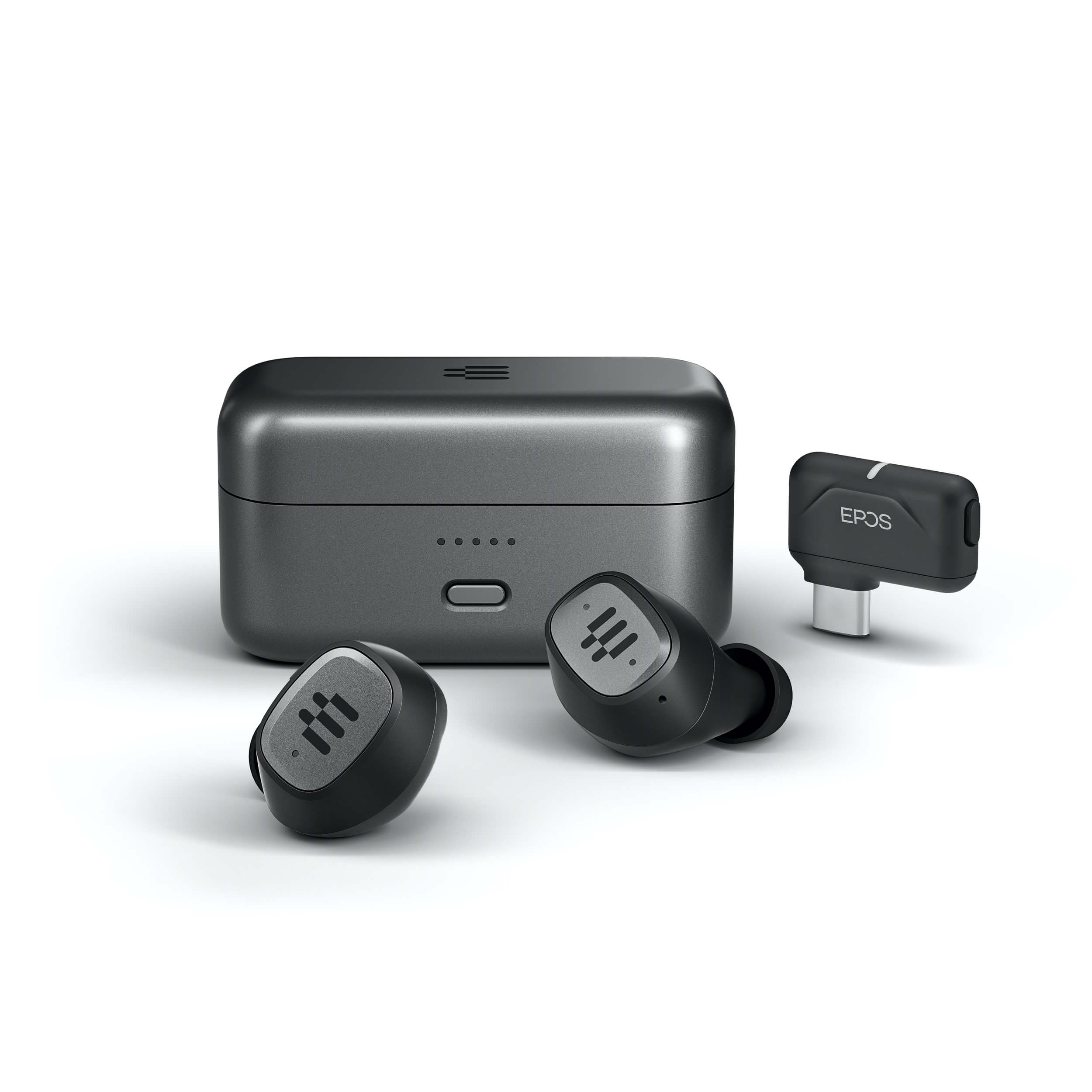 Zum Lieferumfang der EPOS GTW 270 Hybrid gehören eine mobile Ladetasche, ein USB-C-Dongle, unterschiedlich große Ohrstecker und ein USB-C-zu-USB-A Kabel. Der empfohlene Einzelhandelspreis beträgt €199 EUR.