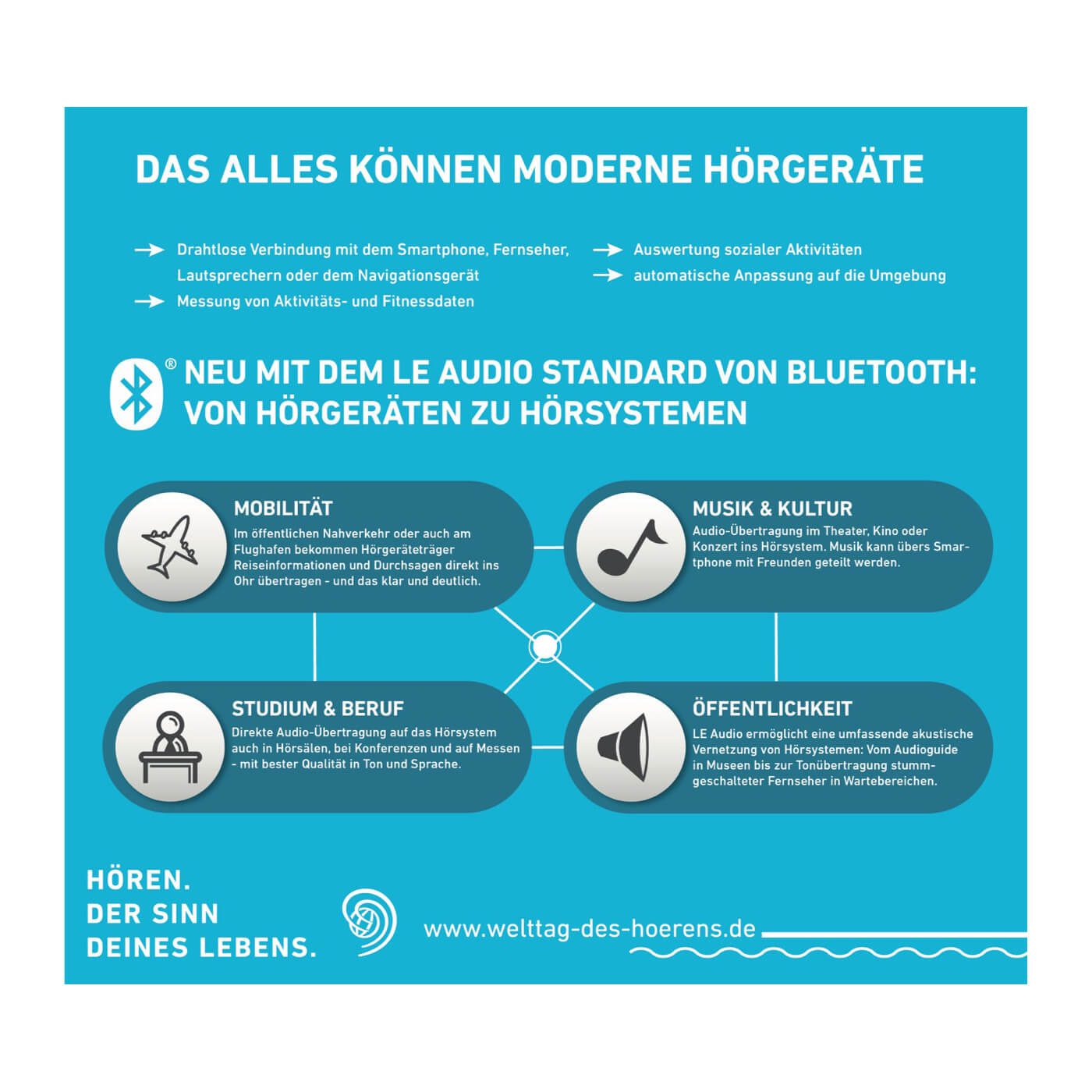 Der kürzlich eingeführte Bluetooth-Audio-Standard „LE Audio“ (zu unserer News) wird dank des geringen Energieverbrauchs, der hohen Klangqualität und Multi-Stream-Audio-Funktionalität Hörgeräte unterstützen. LE Audio wird darüber hinaus Audio Sharing ermöglichen. Mit dieser Funktion kann ein Bluetooth-Audiosender den Ton an eine unbegrenzte Anzahl von Bluetooth-Audioempfängern übertragen. Dadurch könnten Hörgeräteträger Durchsagen auf Bahnhöfen und die Tonspur in Kinos, Theatern oder Konferenzen direkt über das Hörgerät empfangen. Audio Sharing ermöglicht es außerdem, dass Freunde die auf einem Smartphone abgespielte Musik über ihre Bluetooth-Kopfhörer und Hörgeräte gleichzeitig genießen können.