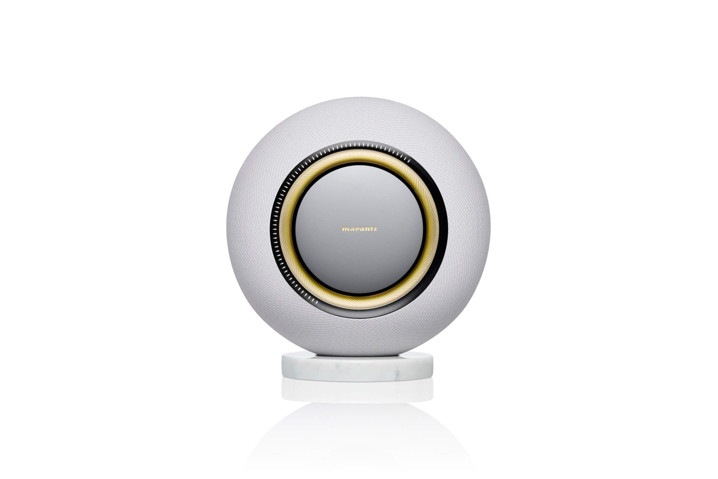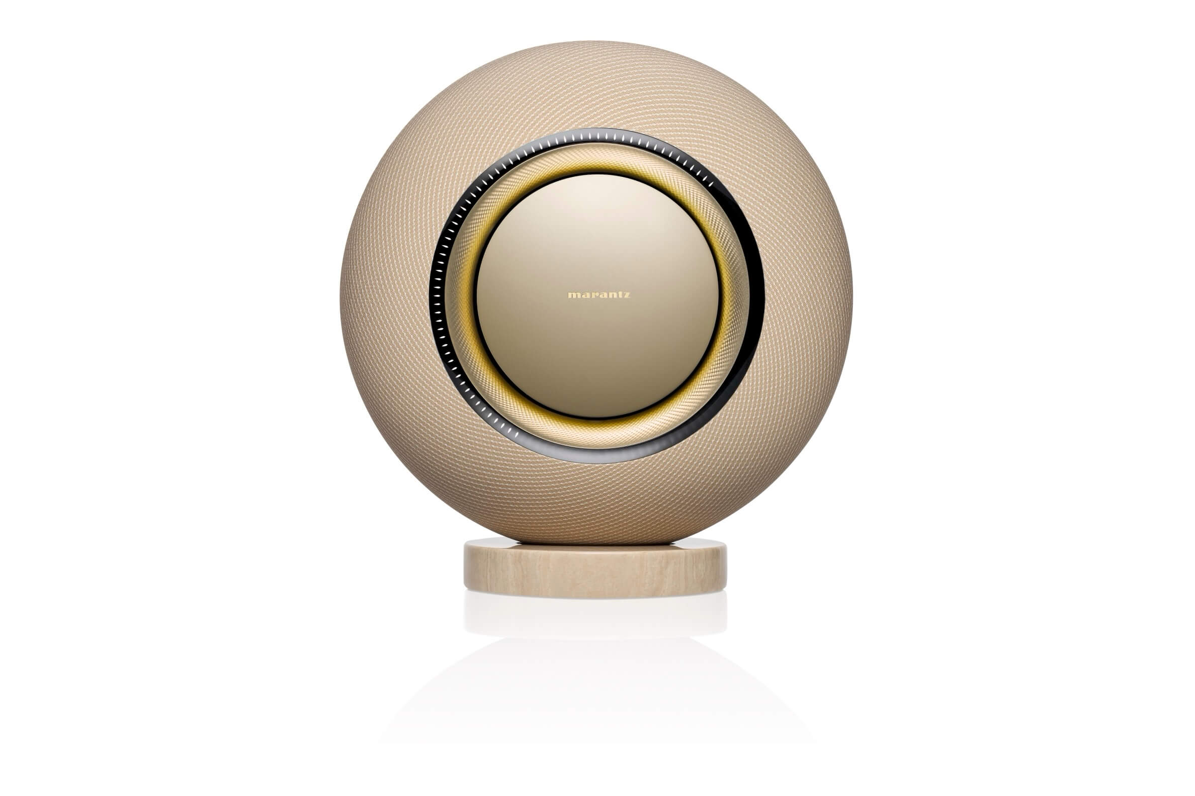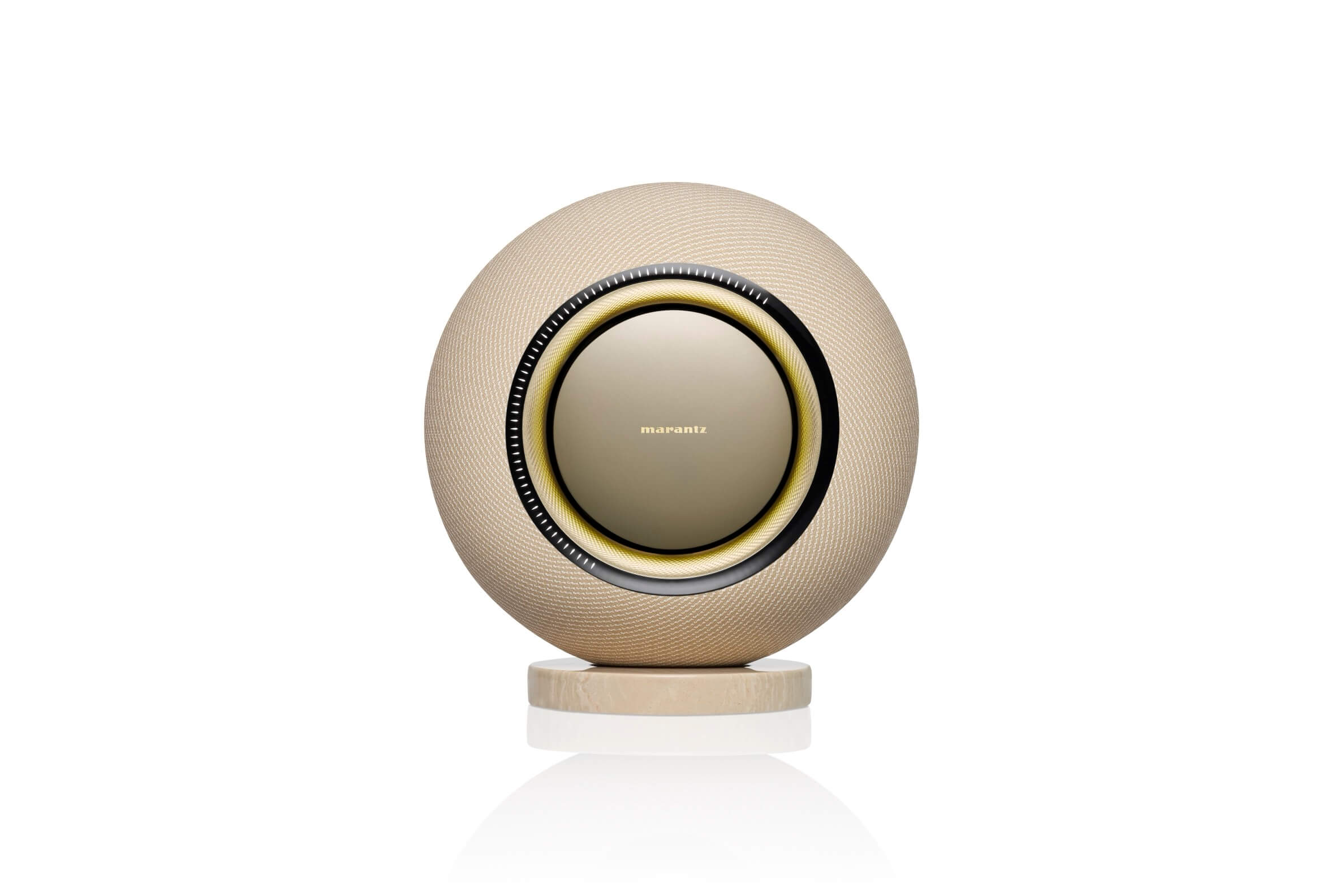 Die kabellosen Lautsprecher Horizon und Grand Horizon vereinen laut Eigenaussage die charakteristischen Design-Elemente von Marantz, wie das ikonische Bullaugen-Display, mit modernster Audiotechnologie. Die markante, runde Form und hochwertige Materialien wie der Marantz Radiance 360° Seamless EcoFiber, ein Stoff aus recyceltem Meereskunststoff, sorge für Eleganz und Nachhaltigkeit. Erhältlich in den Farben Midnight Sky, Moon Ray und Marantz Champagne, unterstreichen die Lautsprecher mit Naturmarmor-Sockeln ihre luxuriöse Ästhetik.
