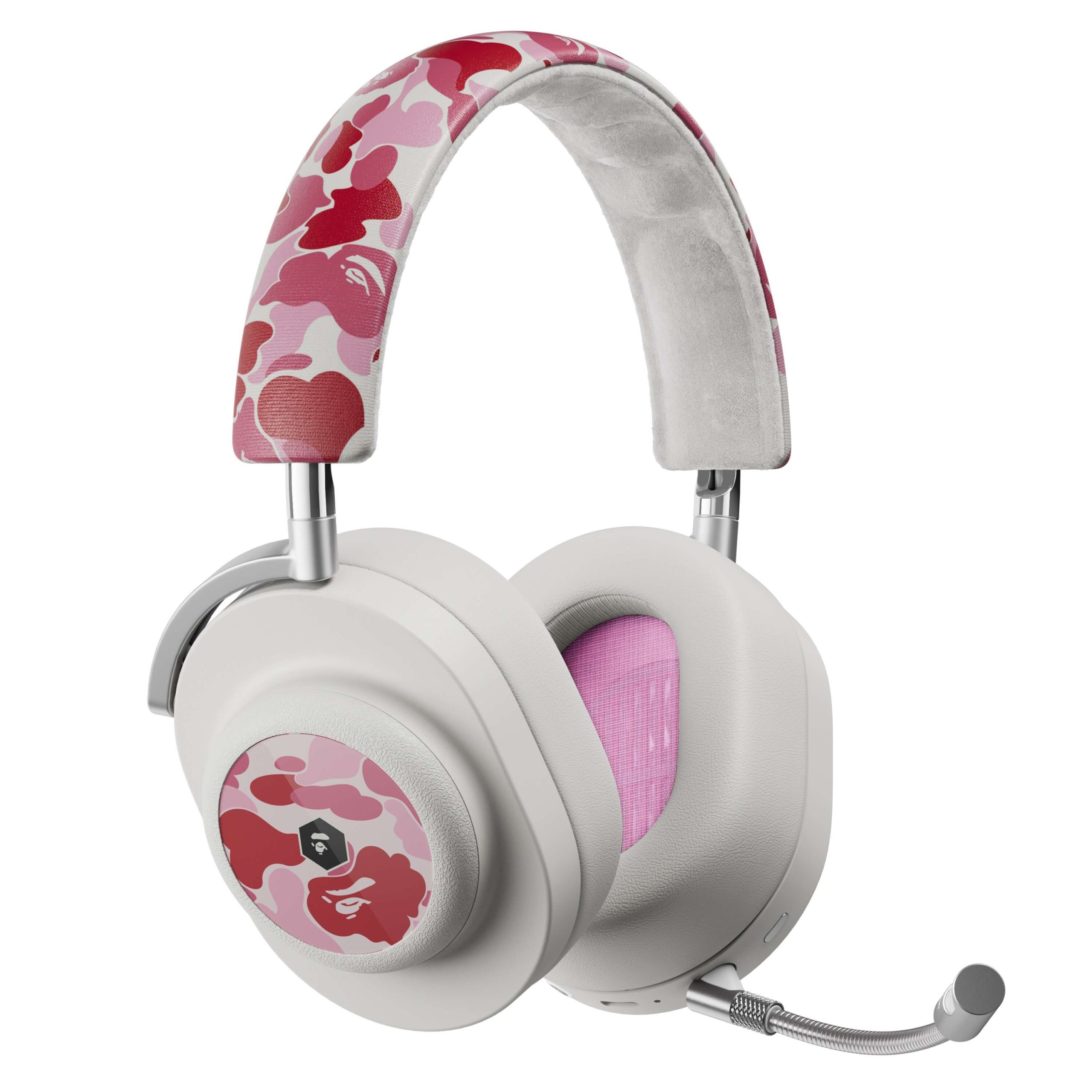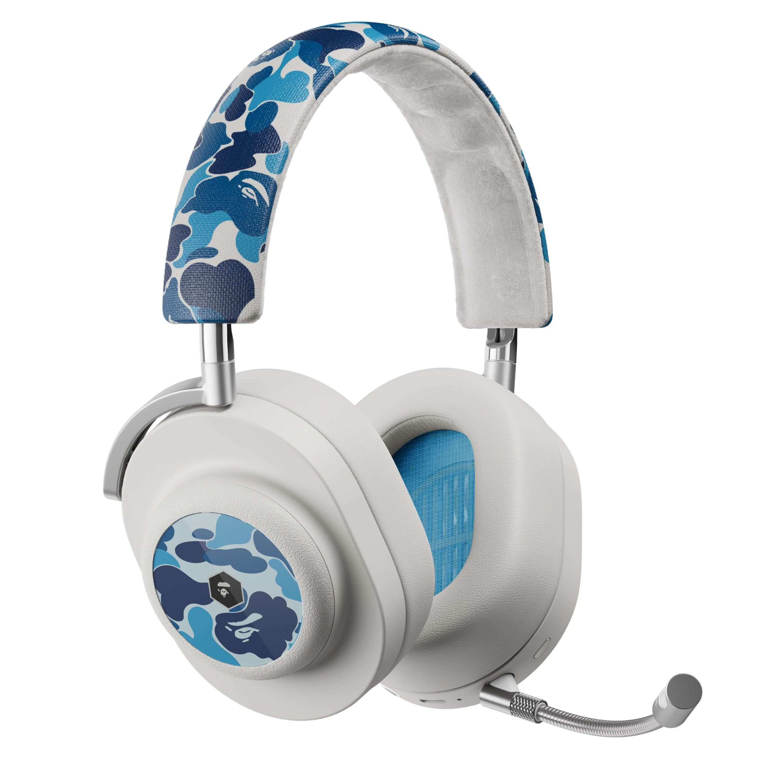 Die Kopf- und Ohrhörer sind mit dem „ABC CAMO“ von BAPE in knalligem Blau und Pink versehen.