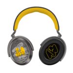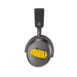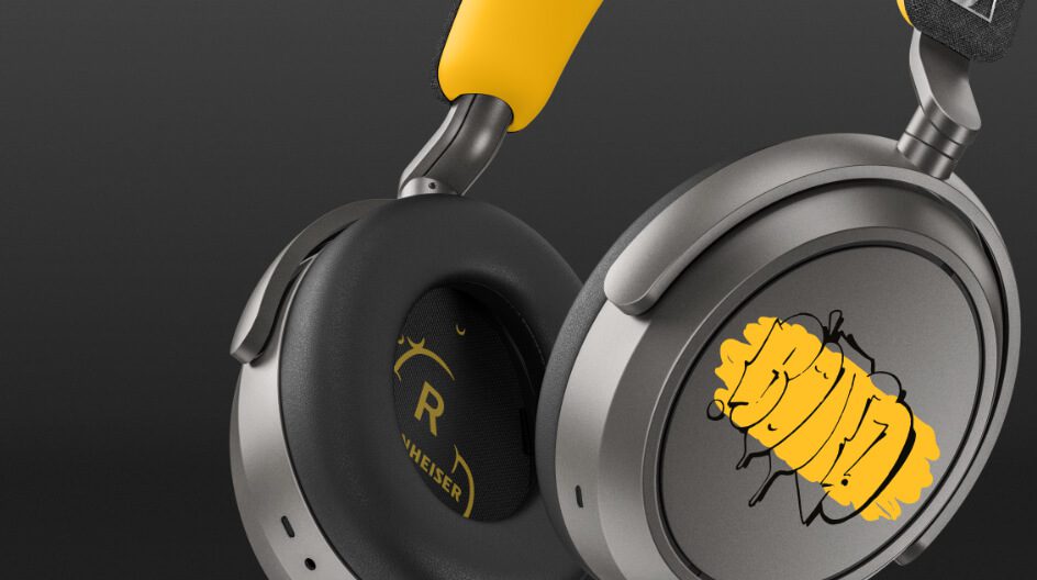 Die linke Hörmuschel zeigt Truluvs typischen Throwie-Tag vor rauem Hintergrund, während die rechte von audiowellenförmigen Linien durchzogen ist – eine Hommage an Klang und Bewegung. Gelbe Akzente zitieren den ikonischen Sennheiser HD 414.