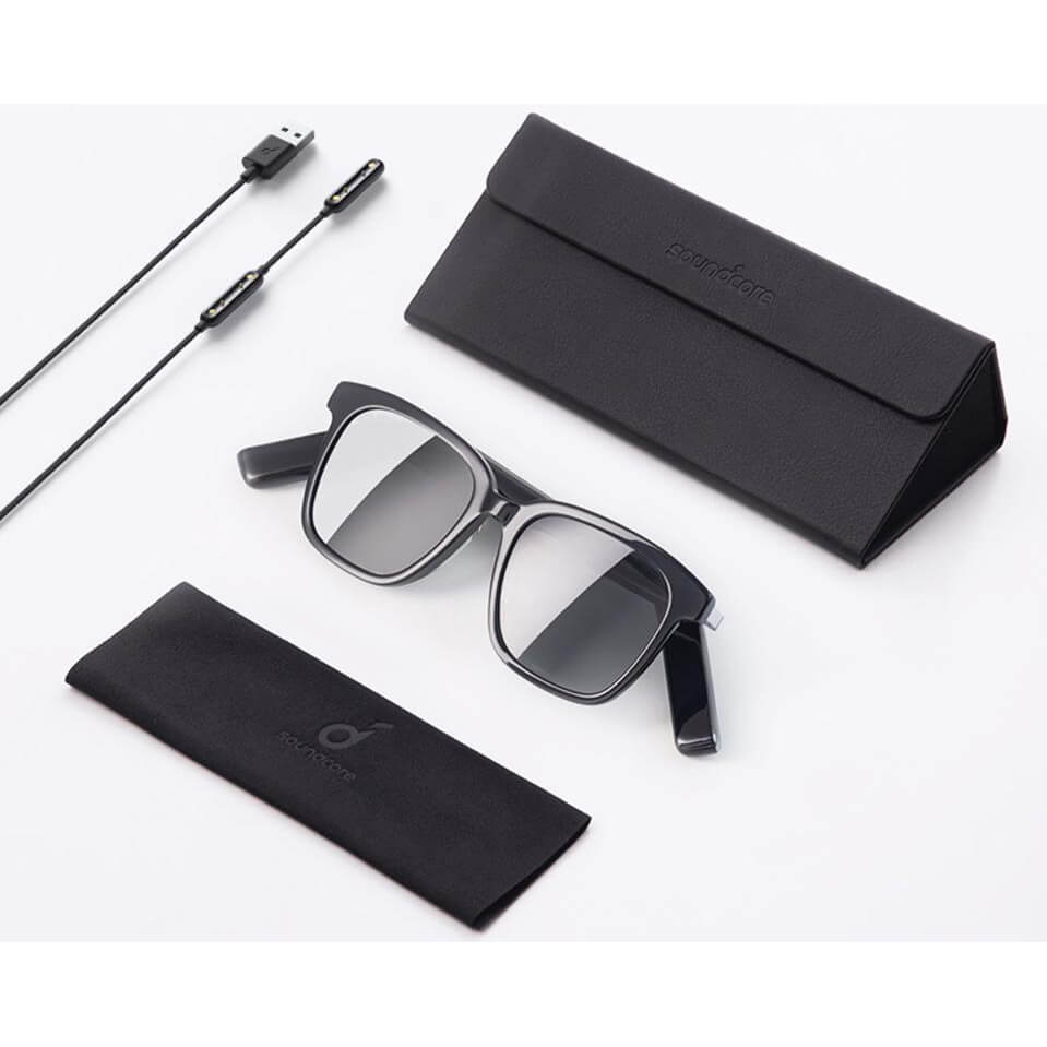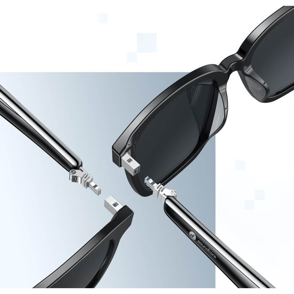 Soundcore geht mit den Soundcore Frames einen anderen Weg und verbaut pro Seite zwei Lautsprecher in die Bügel. Der erste Lautsprecher sitzt dabei vor dem Ohr des Trägers, während der zweite hinter dem Ohr den Klang verstärken soll. Dank Trageerkennung gibt’s sogar eine Auto-Pause-Funktion. Ein spezieller DSP samt Bluetooth 5.2 und AAC-Codec will dabei für ordentlichen Klang sorgen. Somit können die Frames mit Macs, PCs, Tablets, Smartphones und sämtlichen weiteren Bluetooth-Zuspielern verbunden werden.
