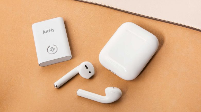 Dank 3,5-mm-Klinkenbuchse kann AirFly an alle Audioquellen angeschlossen werden, die einen analogen (Mini-)Klinkenausgang besitzen. Via Bluetooth wird das Signal dann an die AirPods oder jeden anderen kabellosen Kopfhörer übertragen. Per Mikro-USB-Kabel kann AirFly aufgeladen werden, eine Reisetasche sowie ein Klinkensteckerkabel gibt’s ebenfalls dazu.