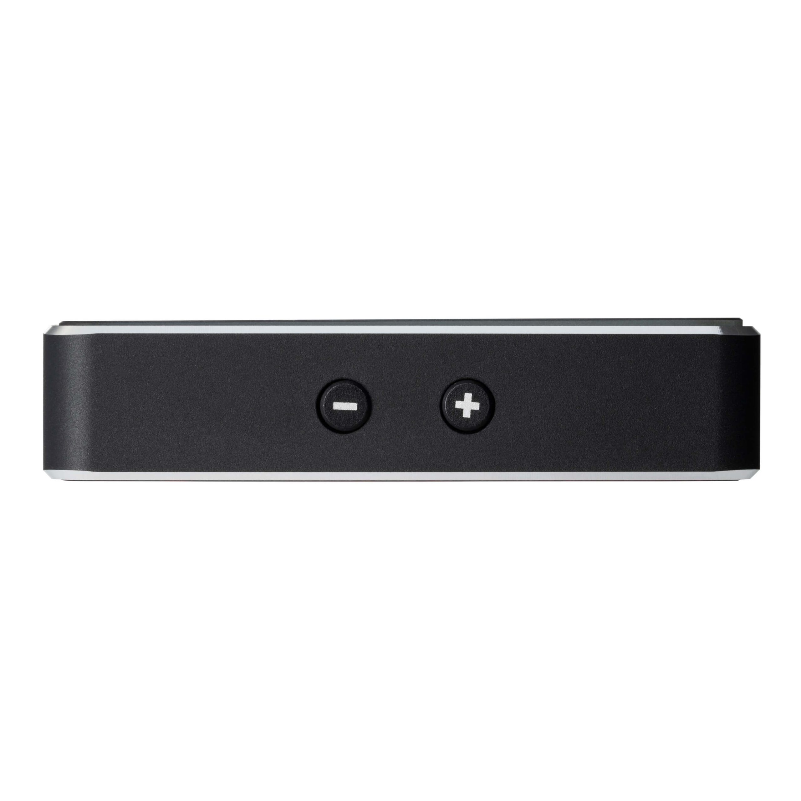 Der kompakte Begleiter wird ganz einfach über eines der drei mitgelieferten Adapterkabel für USB-C, Micro-USB oder Lightning mit dem Mobilgerät verbunden und soll augenblicklich los spielen. Eine Treiberinstallation ist nicht notwendig, denn Chronos wird sowohl von iOS- und Android-Geräten sowie von Windows 10 und Apple-Systemen sofort als Audiogerät erkannt. Mit einem Stromverbrauch von maximal 200 mA soll das kompakte Klangwunder den Akku des Zuspielgerätes dabei kaum belasten – für ein langanhaltendes mobiles Klangerlebnis. Dabei soll das Display nicht nur dezenten HiFi-Charme versprühen, sondern hat auch eine praktische Funktion: Bei der Wiedergabe von Audiodaten im PCM-Format leuchtet die Schrift grün, hochauflösende DSD-Files werden in Blau angezeigt. Hochwertige Tasten auf der Geräteseite ermöglichen die Anpassung der Lautstärke.