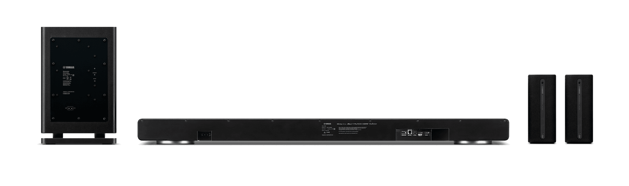 Zum Lieferumfang gehören der neue Yamaha True X Subwoofer mit Symmetrical Flare Port Design und zwei kabellose True X Surround-Lautsprecher. Letztere lassen sich herausnehmen und auch als portable Bluetooth-Lautsprecher verwenden. Zwei Ladeschalen sind im Paket enthalten.