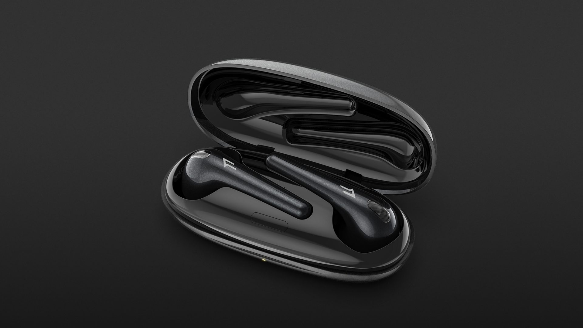 Die Konstruktion darf man als Ear-Buds einordnen, denn die Plastikschalen sitzen lediglich am Eingang des Ohres. Zwar gibt es vorne einen kleinen Silikon-Abschluss, aber keine wechselbaren Passstücke. Die durchaus schicken Hörer aus schwarzem oder weißem Kunststoff sind angenehm leicht und weisen einen Fortsatz nach unten auf, in dem eine dekorative blaue Status-LEDs sitzt. Diese leuchtet rot, wenn der Akku zur Neige geht. Das Lade-Case mit dreifarbiger Status-LED hingegen ist zwar kompakt, jedoch wie die Hörer nicht sonderlich robust.