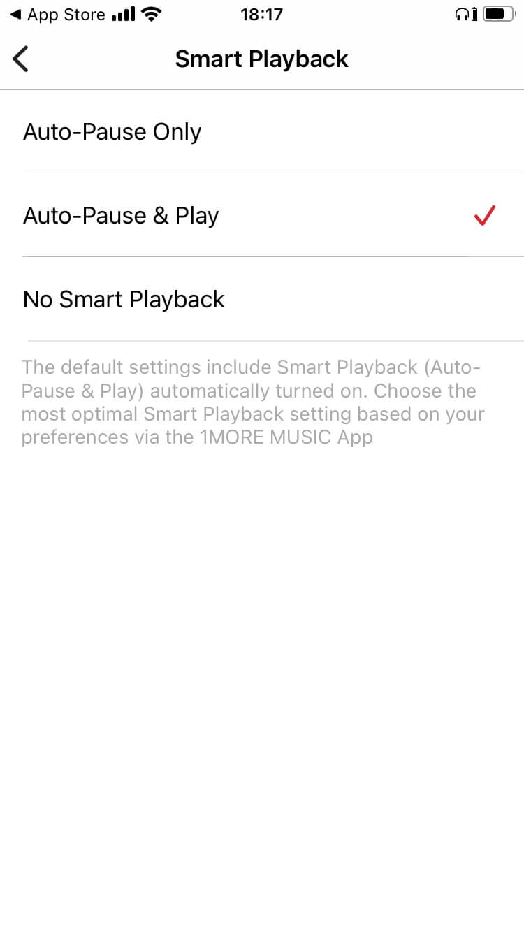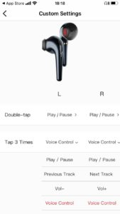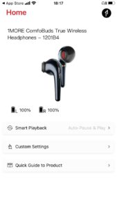 Die Touch-Bedienung an den Ohrhörern ist auf zwei Funktionen reduziert: Doppel- und Dreifachklicks. Ab Werk sind diese mit Start und Pause für die Musikwiedergabe sowie das Beantworten und Beenden von Anrufen belegt, während dreifaches Antippen eine mögliche Sprachsteuerung im Smartphone aufruft. Über die kostenfreie App „1more Music“ für iOS und Android lassen sich die Funktionen aber bei Bedarf auch anders konfigurieren. So gibt es beispielsweise eine alternative Lautstärkesteuerung oder einen möglichen Titelsprung nach vorn und hinten. Ebenfalls konfigurierbar ist das sogenannte „Smart Playback“. Aktiviert, erkennen die ComfoBuds, wenn ein Hörer aus dem Ohr genommen wird. Das Playback wird sodann angehalten und, je nach Einstellung, beim Wiedereinsetzen automatisch fortgesetzt. Abschließend sei noch die über die App gebotene Einbrennfunktion der Treiber erwähnenswert.