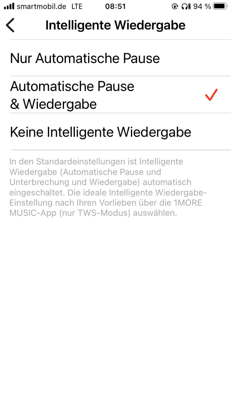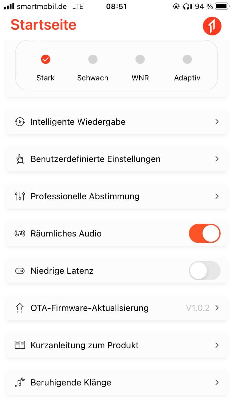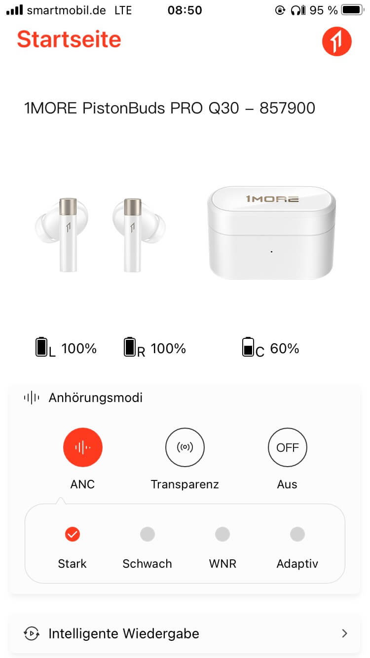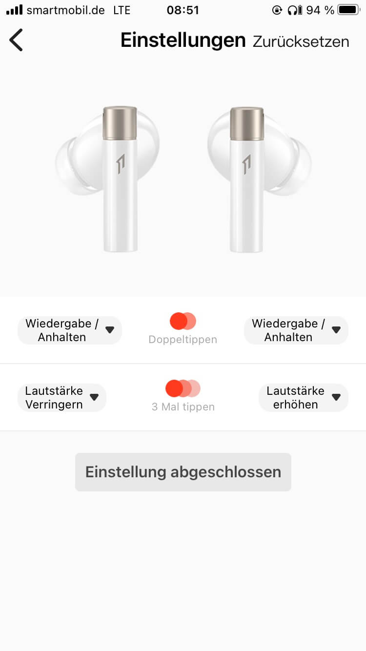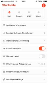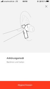 Die Touch-Steuerung war für mich aufgrund der Bauform und ohne klar erkennbaren berührungsempfindlichen Bereich zunächst etwas irritierend. In der Praxis tippt man aber einfach auf die Außenseite. Dabei sind konfigurierbare Zwei- und Dreifachklicks zur Funktionssteuerung der Musikwiedergabe, von Telefonaten und dem Aufruf des Sprachassistenten im Smartphone vorgesehen. Hinzu kommt die Möglichkeit, durch langes Berühren, zwischen den Betriebsarten des Noise Cancelling zu wechseln. Diese Umschaltung erklärt dann auch, dass die Testgeräte nach dem Herausnehmen (und somit einer längeren Berührung) teils im Transparenzmodus starteten, obwohl das Noise Cancelling zuvor eingeschaltet war.