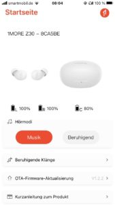 Wie üblich werden die Kopfhörer durch die kostenlose iOS- und Android-App 1More Music erkannt. Diese bietet die Möglichkeit zu Firmware-Updates, verzichtet aber auf einen Equalizer zur Personalisierung des Klangbildes. Dafür lassen sich hier die eigentlichen Maskierungsklänge, die als Schlafhilfe fungieren sollen, aufrufen. Hierzu lässt sich ein lokaler Speicher im Kopfhörer mit sechs Sounds aus einer Auswahl diverser Naturklänge befüllen. Die entsprechenden Klänge werden sodann nicht mehr über Bluetooth, sondern batterieschonend aus dem internen Speicher wiedergegeben.