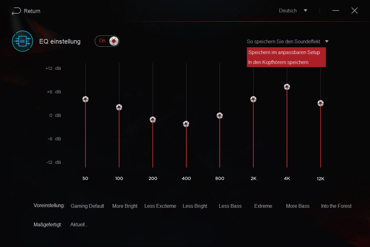 Wie in jeder guten Software finden wir zu guter Letzt auch einen Equalizer. Mittels acht Bänder dürfen wir also in den Sound eingreifen. Dazu gibt es acht Presets und die Möglichkeit, eigene zu erstellen. Speichert man seine Einstellung in der Software, lässt sie sich hier immer wieder abrufen und verändern. Ein besonderer Clou: Zusätzlich kann man ein Preset auch auf dem Kopfhörer speichern – das ist äußerst praktisch, wenn man den Kopfhörer beim Kumpel anschließt, der die Spearhead-Software gar nicht installiert hat. Ihr könnt so also trotzdem mit eurem Lieblings-EQ-Setting zocken. Es gibt aber eine Einschränkung: Dies funktioniert nur in Verbindung mit dem USB-Kabel, nutzt man das Audiokabel, funktioniert das nicht.