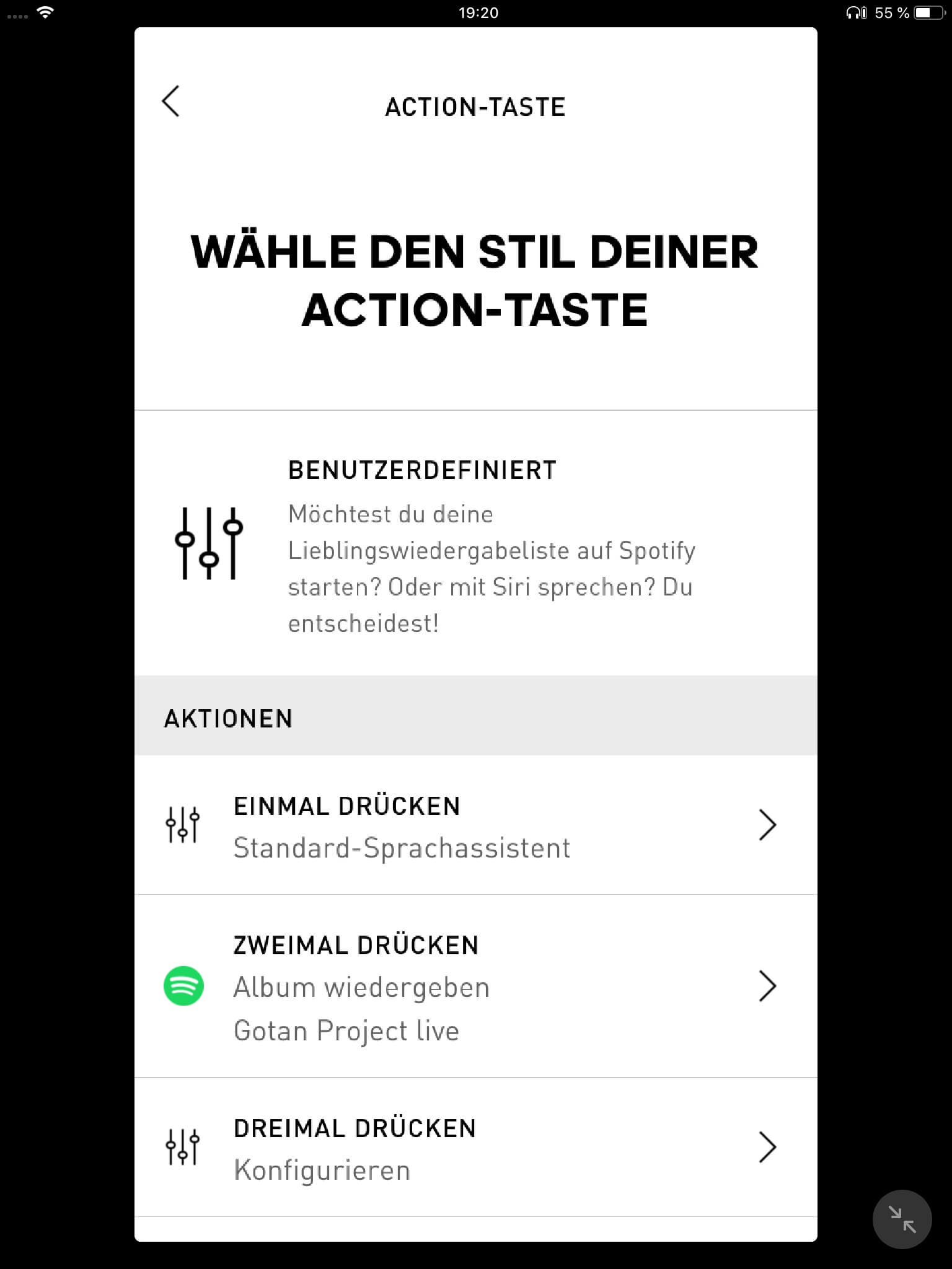 Eine gelungene Erweiterung an Steuerungsoptionen bietet der Aktionstaster, dem über die kostenlose Adidas Headphones App bis zu drei zusätzliche Funktionen zugewiesen werden können. In der Standardeinstellung dient dieser zum Aufrufen des Sprachassistenten. Zudem ist durch eine Verknüpfung mit Spotify die Wiedergabe von Künstlern, Playlisten oder Alben möglich. Neben der Tasterkonfiguration können mithilfe der App auch Firmware-Updates vorgenommen werden und individuelle Klanganpassungen per EQ erfolgen. Hierzu stehen mehrere vorgefertigte Presets für Rock, Pop, Hip-Hop oder Electronic und gesprochene Inhalte zur Auswahl, wobei auch eigene Einstellungen speicherbar sind.