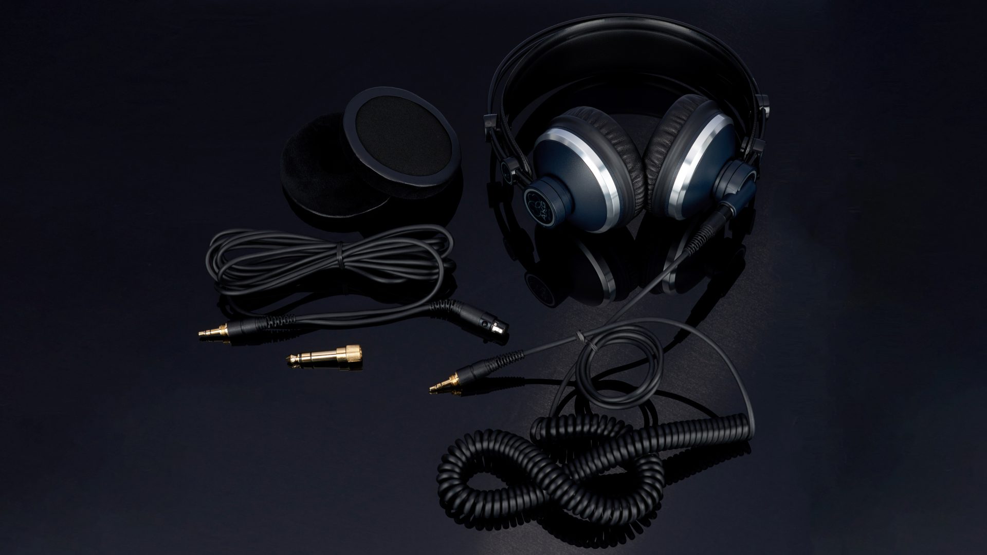 Mit etwa 200 Gramm gehört der K171 MKII zu den Leichtgewichten. Die einseitige Kabelführung mit dem robusten 3,5 mm Klinkenstecker und Zugentlastung an der rechten Seite sind vorbildlich. Neben dem 3 m Standard-Kabel legt AKG zusätzlich ein 5 m Wendelkabel mit bei – anstecken und Fallstricke oder die gefürchtete Studiostuhlkabelwalze sind passé. Und ein zweites Ohrpolster-Paar ist auch dabei – löblich, bei anderen Herstellern geht das ins Geld.
