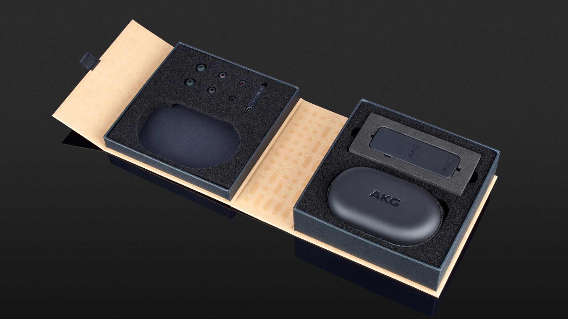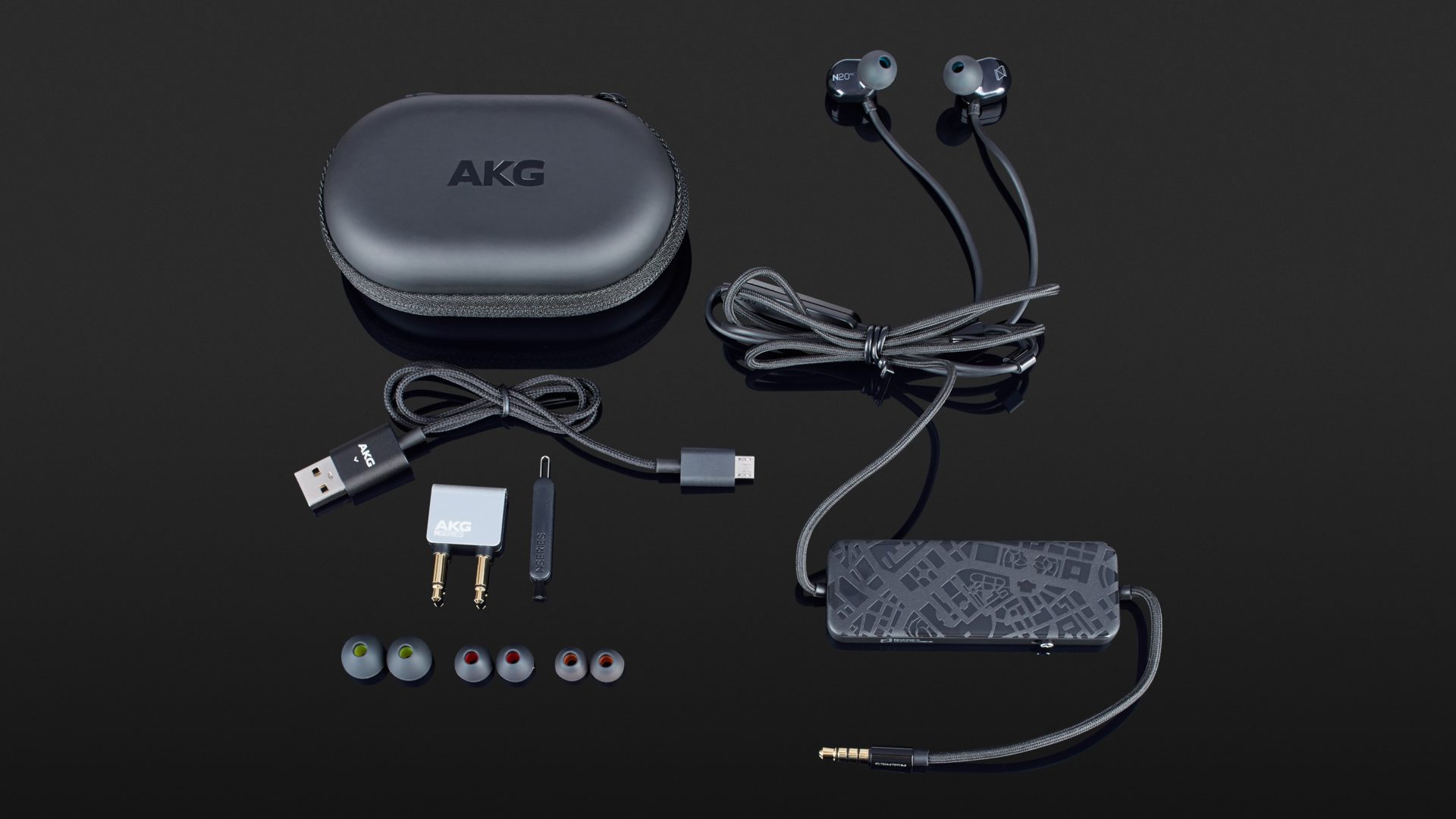 Anders als sein Vorgänger ist der Body des N20 NC nicht aus Aluminium, sondern aus schwarzem Plastik gefertigt. Der Hauptteil des Kabels ist aus schwarzem Textilkabel, erst die Verzweigung in die beiden Ohrstöpsel ist dann glatt. Bei der Materialwahl haben AKG auf einen ziemlich dicken und robusten, damit aber auch etwas starren und ungeschmeidigen Querschnitt gesetzt, der ein bisschen störrisch am Kopf baumelt. Der Blick in die hübsch designte Verpackung befördert dann das Zubehör ans Licht: Vier farblich markierte Ohrpassstücke (XS, S, M, L) einen Flugzeugadapter, ein USB-Ladekabel (für die Batterie der Geräuschunterdrückung) und eine kleine, schwarze Aufbewahrungstasche. Leider ist – wie bei vielen Herstellern – auch beim N20 NC kein Standard-Klinken-Adapter inkludiert. Was besonders deshalb wünschenswert wäre, weil der vierpolig beschaltete Miniklinken-Stecker nicht mit den gängigen, schraubbaren Klinkenadaptern funktioniert.