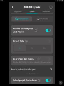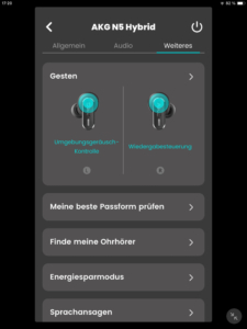 Die AKG N5 Hybrid unterstützen eine einseitige Nutzung im Single-Betrieb und verfügen über eine Trageerkennung, die sich per App nach Bedarf ab- oder zuschalten lässt. Nicht vorgesehen ist dagegen ein manuelles Ein- und Ausschalten der Hörer über die Touch-Oberflächen, wodurch das Case stets benötigt wird.