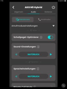 Besonders an den AKG N5 Hybrid ist, dass sie sowohl per Bluetooth als auch latenzarm über den USB-C-Dongle betrieben werden können. Der 2,4-GHz-Dongle ermöglicht darüber hinaus eine hochauflösende Wiedergabe, was bei Geräten, die keine hochwertigen Audiocodecs unterstützen, Vorteile bietet und das Einsatzspektrum erweitert. Schade ist nur, dass das Umschalten zwischen Bluetooth und Dongle im dualen Betrieb etwas umständlich erscheint und Abstriche bei der App gemacht werden müssen.