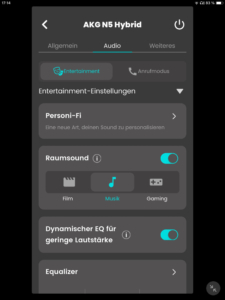 Mit „Studio“, „Bass“, „Club“, „Extreme Bass“, „Vocal“ und „Jazz“ stellt die Klangregelung der App-Anbindung (Android und iOS) sechs vorkonfigurierte Settings zur Auswahl. Eigene Einstellungen lassen sich hingegen über einen 10-Band-EQ vornehmen, die als Presets gespeichert werden können. Außerdem kann ein Hörtest absolviert werden, der das Hörvermögen von linkem und rechtem Ohr separat analysiert, um auch Disbalancen auszugleichen. Allerdings ist die Klangpersonalisierung leider nicht mit LDAC kompatibel, was auch auf Spatial Audio zutrifft. Darüber hinaus lässt sich ein dynamischer EQ für geringe Lautstärkeeinstellungen aktivieren oder die L/R-Balance in jeweils 16 Schritten anpassen. Auch ein Gehörschutz kann eingerichtet werden, wodurch der maximale Ausgabepegel auf unter 85 Dezibel begrenzt wird.