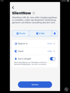 Viel Flexibilität bietet die Umgebungsgeräuschkontrolle der App, welche sowohl einen adaptiven als auch einen manuellen ANC-Modus mit sieben Intensitätsstufen zur Verfügung stellt. Auch der Ambient-Aware-Modus ist in sieben Stufen anpassbar, während sich die TalkThru-Funktion wahlweise per Taster oder Sprache steuern lässt. Über die SilentNow-Funktion besteht zudem die Möglichkeit, die Geräuschunterdrückung für ein stilles Nickerchen zu nutzen, indem ein Vorlauf und die gewünschte Schlafenszeit eingestellt wird. Anschließend klingelt ein Wecker.
