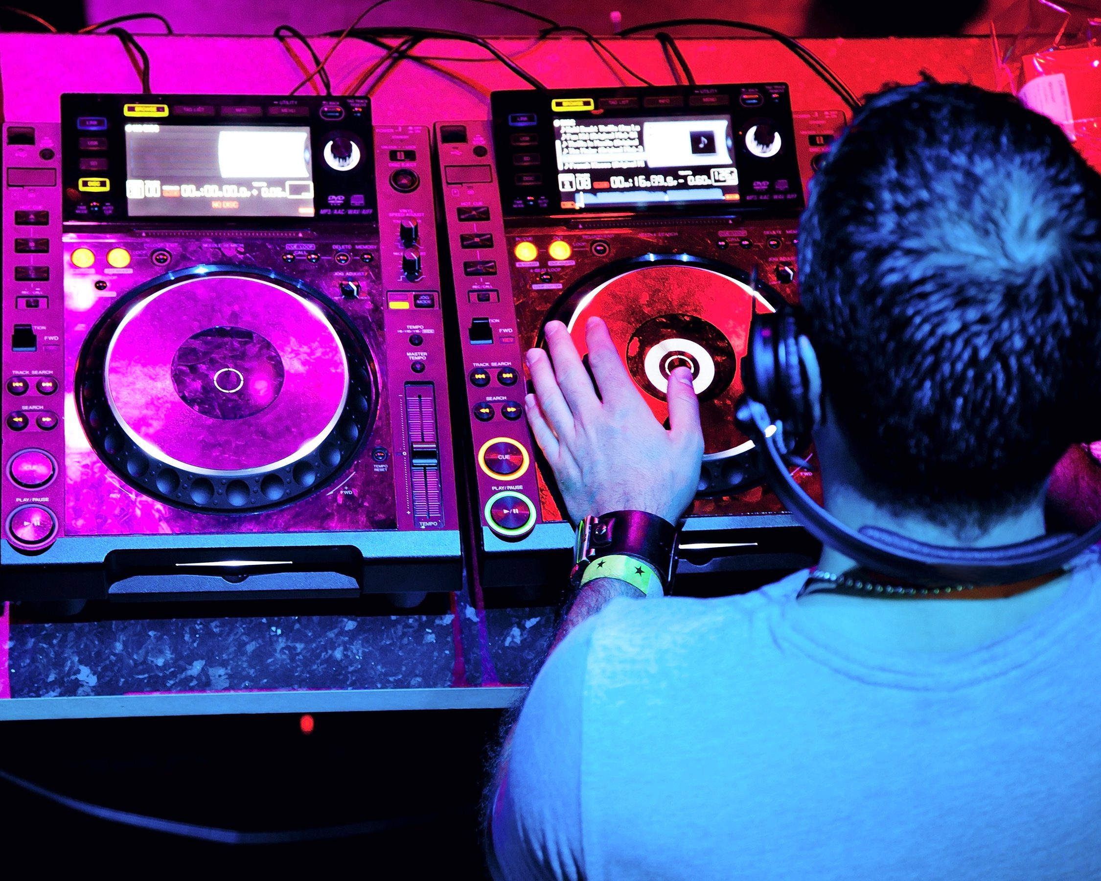 - Dj in headphones mixes the track in the nightclub at party