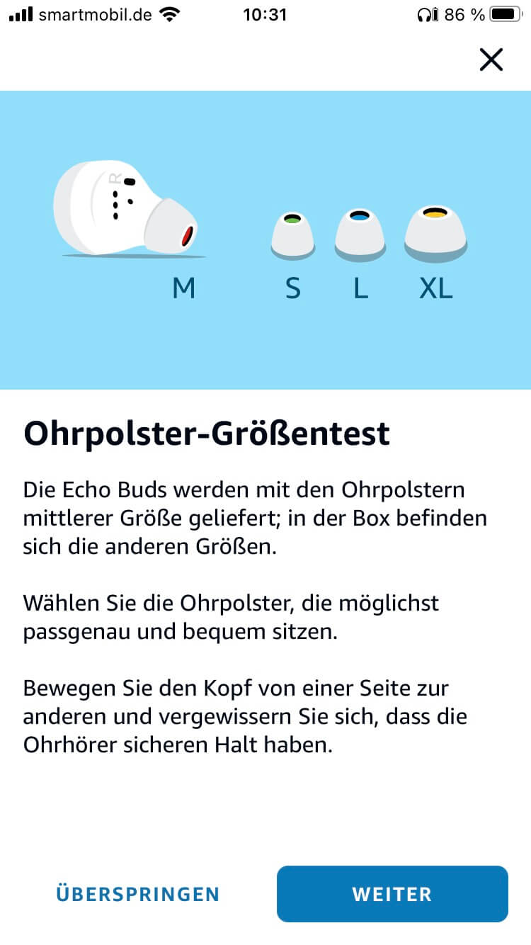 Die ergonomisch geformten und leichten Ohrstücke der Amazon Echo Buds (2. Gen.) passen dank vier Paar Silikonstöpseln und zwei ergänzenden Ohrbügeln (Wing Tips) durchaus sicher und recht druckfrei ins Ohr. Ergänzend bietet die Alexa App die sinnvolle Möglichkeit, die Passform zu kontrollieren. Für den täglichen Mobileinsatz war der Tragekomfort völlig ausreichend. Für aktive Sportarten würde ich zu den Wing-Tips greifen, die zusätzlichen Halt im Ohr bieten. Hier kommt es gerade recht, dass die App einen Workout-Modus bietet und dabei Schrittzahlen und weitere Parameter erfassen sowie darstellen kann.