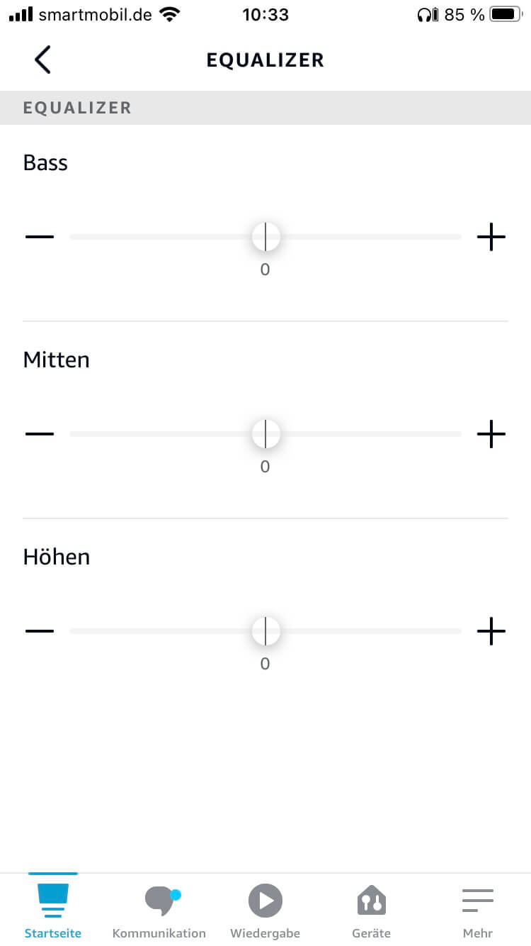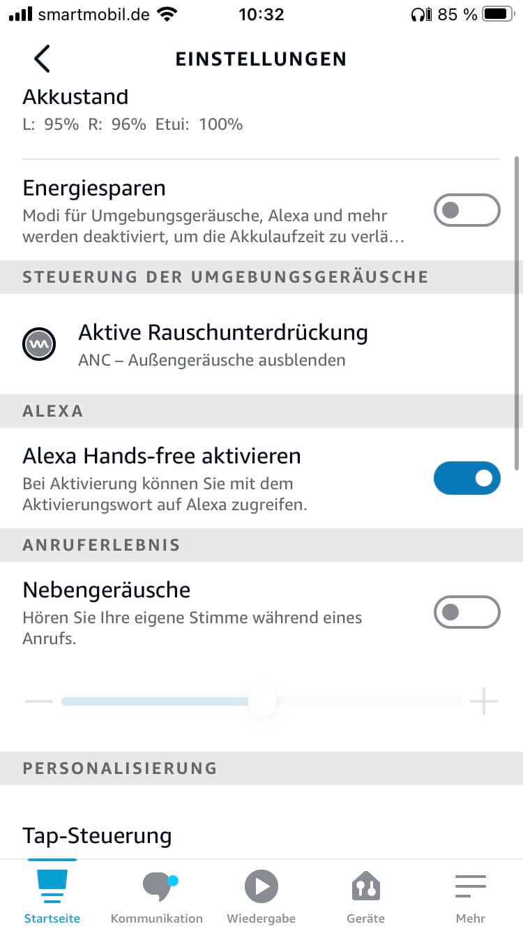 In den Mitten gibt es zunächst eine leichte Senke, die sich in den Hochmitten zu einer Betonung umkehrt. Bei höherem Pegel kann das zu Härten führen, insbesondere bei aggressiven Abmischungen und verzerrten Gitarren, etwa Meshuggahs „Bleed“. Bei bedeckteren Mischungen wie Slayers „Repentless“ kann sich diese Betonung durchaus positiv auswirken. In den Höhen selbst stellte ich keine unangenehmen Härten fest, aber auch nicht den Glanz teurerer Konstruktionen. Immerhin: Der Equalizer in der Alexa App kann hier stellenweise unterstützen. Für einen Feineingriff in die Frequenzabstimmung reichen die drei bereitgestellten Bänder jedoch nicht aus. Das Noise Cancelling sollte man eingeschaltet lassen, weil es für einen zusätzlichen Störgeräuschabstand sorgt. Das ist insbesondere unterwegs von Vorteil.
