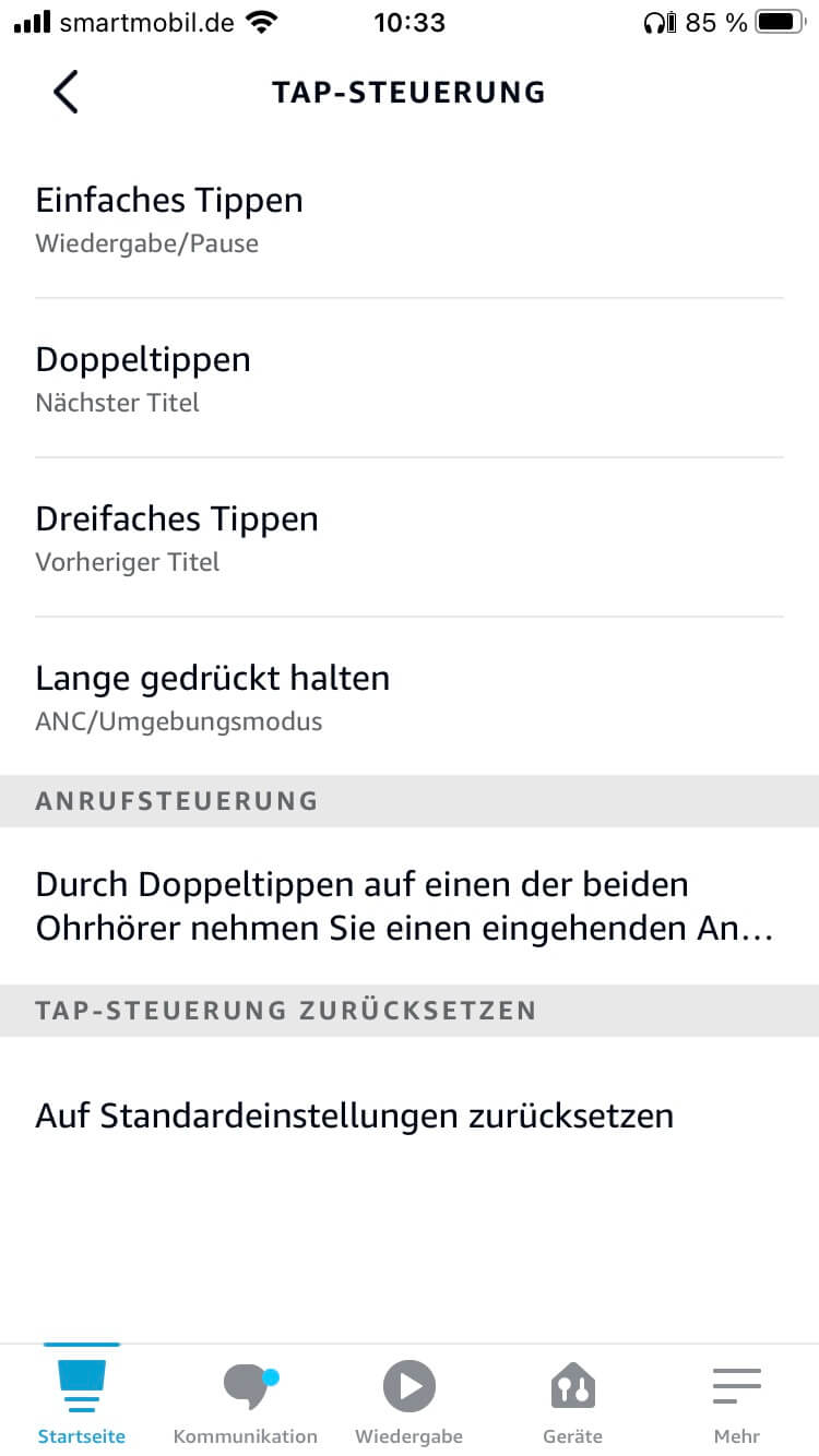 Über die Touch-Funktionen lässt sich die Musikwiedergabe starten und pausieren, ebenso wie Telefonate. Es gibt zudem die Möglichkeit zu Titelsprüngen. Ein, zwei- und Dreifachklicks sowie langes Drücken lassen sich über die App aber auch anders konfigurieren, teils sogar getrennt für die linke und rechte Seite. Die Auswahl an möglichen Funktionen ist allerdings reduziert und bietet beispielsweise, anders als der Vorgänger, keine Lautstärkekontrolle. Das längere Drücken, das typischerweise zwischen Noise-Cancelling und Transparenzmoduls umschaltet, dauert mir in der Praxis zu lange.