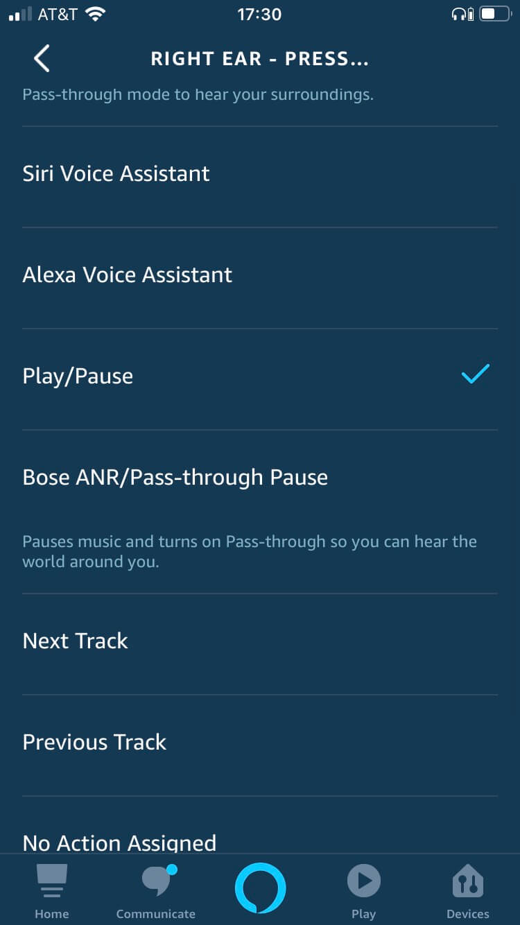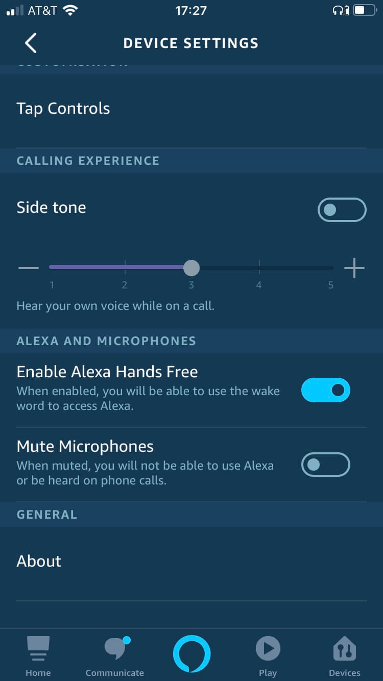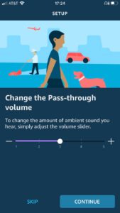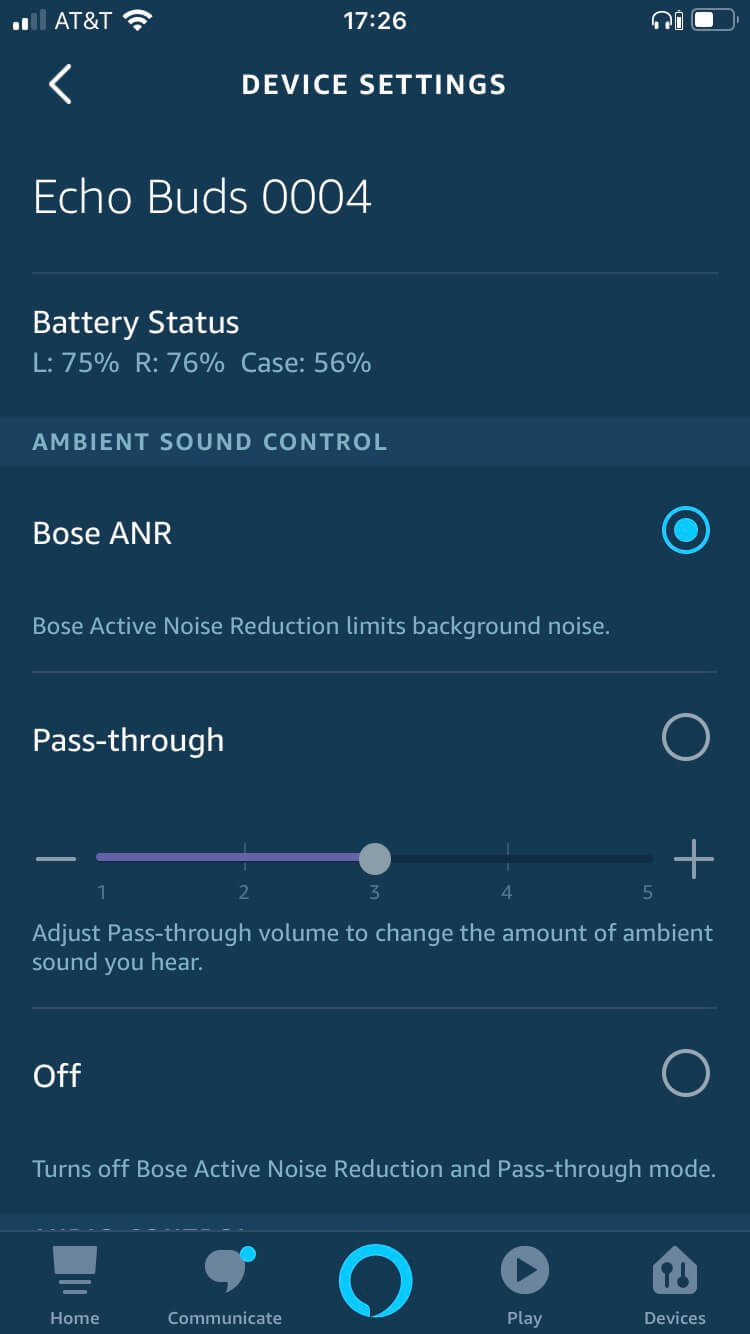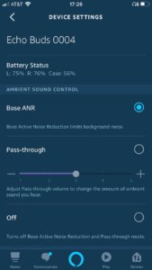 Die Konfiguration dieser Funktionen erfolgt über die Alexa App, die auch einen dreibandigen Equalizer bereitstellt. Sinnvoll gelöst ist die mögliche Kommunikation mit nur einem Ohrstöpsel. Auch das automatische Pausieren der Musikwiedergabe beim Herausnehmen eines Hörers ist praxisgerecht.