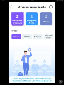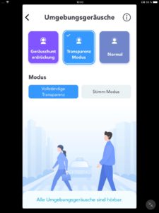 Auch die Verstärkung von Außengeräuschen erscheint nicht unbedingt leistungsstark, da der vollständige Transparenzmodus lediglich bei niedriger Wiedergabelautstärke eine Orientierung im Freien ermöglicht. Ähnlich verhält es sich im speziellen Stimmenmodus, der darüber hinaus Nebengeräusche abschwächt. Allerdings leidet die Sprachverständlichkeit von Lautsprecherdurchsagen und Mitmenschen unter einer recht diffusen Darstellung, da zudem ein wahrnehmbares Grundrauschen vorhanden ist und eine Anhebung im Bassbereich bei der Wiedergabe erfolgt, was im vollständigen Transparenzmodus nicht der Fall ist. Als vorbildlich kann jedoch die Bedienbarkeit und Stabilität der App bezeichnet werden, die ausgereift, übersichtlich und funktional wirkt. Zumal per Widget zusätzlich ein direkter Zugriff auf die Auswahl der ANC- und Transparenzmodi eingerichtet werden kann, was ebenfalls einwandfrei funktioniert.