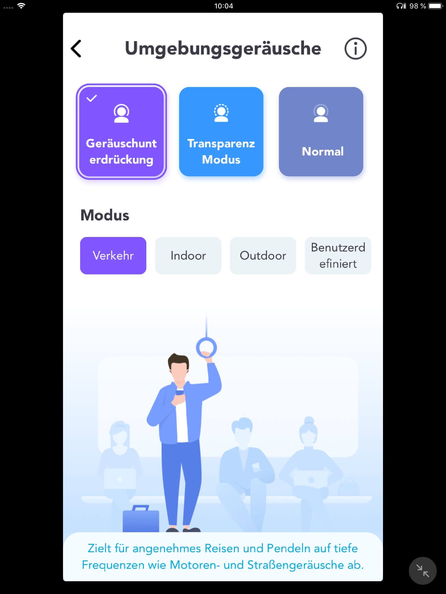 Über die kostenlose Soundcore App für iOS- und Android-Systeme kann die Auswahl des gewünschten ANC- und Außenwahrnehmungsmodus erfolgen. Seitens der Geräuschunterdrückung stehen Konfigurationen für Außen und Innenräume, ein Reise-Setting sowie eine anpassbare User-Funktion zur Verfügung. Hierbei ist der Transportmodus primär auf die Reduzierung von tieffrequenten Störgeräuschen, der Outdoor-Modus auf komplexere Quellen und der Indoor-Modus auf Hintergrundstimmen zugeschnitten. An sich eine gute Idee, wobei die Intensität der Abschwächung insgesamt nicht sehr hoch ausfällt. Im Außeneinsatz ist zwar erkennbar, dass Straßenlärm im Prinzip gut vermindert werden kann, allerdings ist die Absenkung selbst eher subtilerer Natur. Darüber hinaus verändert sich der Klang, da im Transportmodus der Bassbereich und im Outdoor-Modus tiefe bis mittlere Frequenzen angehoben werden, während im Indoor-Modus vorwiegend die Mittendarstellung ein wenig präsenter wirkt.