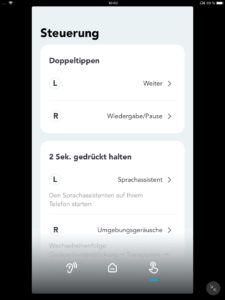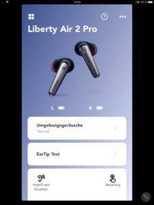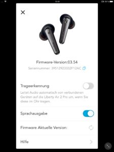 Gut umgesetzt ist hingegen, dass die zuverlässig reagierende Touch-Steuerung der Liberty Air 2 Pro per App innerhalb eines vorgegebenen Rahmens angepasst werden kann. Insofern lässt sich bei Bedarf eine Lautstärkeregelung nutzen, die in der Standardbelegung nicht vorgesehen ist. In der Werkseinstellung steuert ein zweifaches Antippen der rechten Seite die Wiedergabe, was linksseitig zum Vorspringen bei der Titelauswahl dient. Zudem lassen sich per Doppeltipp mit beiden Hörern Anrufe annehmen, die durch ein Halten der berührungsempfindlichen Oberflächen abgelehnt oder beendet werden können. Darüber hinaus erfolgt durch ein Halten auch das (De-)Aktivieren der Geräuschunterdrückung. Ergänzend zur Touch-Steuerung sind die Hörer mit einer sogenannten Ohrerkennung ausgestattet, so dass die Wiedergabe mit dem Ablegen pausiert, was über die App allerdings jederzeit deaktivierbar ist.