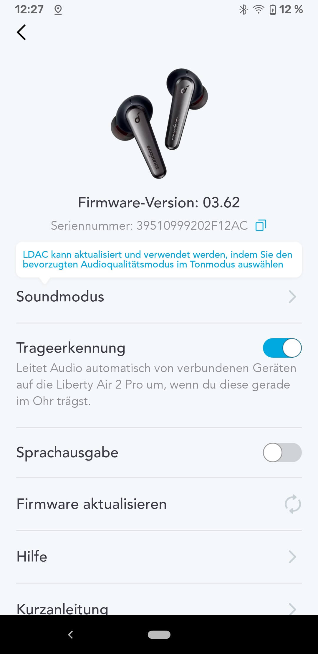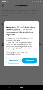 Das nennen wir mal Produktpflege! Soundcore rüstet die Liberty Air 2 Pro mit dem hochauflösenden Codec LDAC nach. Dazu müsst ihr einfach die Soundcore-App für Android laden und auf die neueste Firmware (ab Version 05.63) upgraden. Im Menüpunkt „Soundmodus“ steht sodann der neue Codec als Auswahlmöglichkeit bereit.