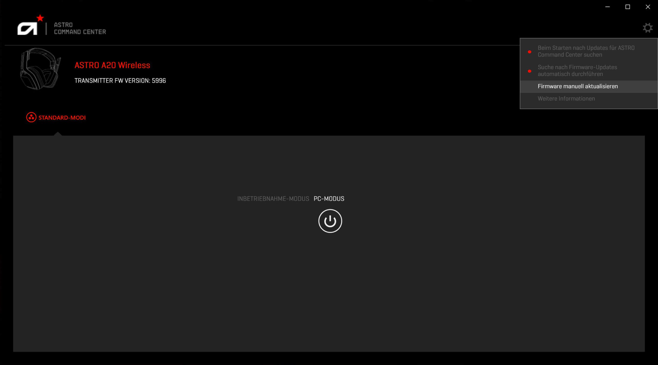 Das Astro Command Center erkennt die A20, nur einstellen kann man hier leider gar nichts – weder lassen sich EQ-Settings bearbeiten und speichern noch in den Mikrofon-Klang eingreifen. Lediglich Firmware Updates lässt die Software zu. Das ist uns definitiv zu wenig! Wenn der Hersteller hier wenigstens eine visuelle Kontrolle eingebaut hätte, um zu erkennen, welches der drei fest verbauten EQ-Settings auf dem Kopfhörer gerade aktiv ist – so bleibt es ein akustisches Rätselraten, ob gerade das Astro-, das Studio- oder das Pro-Preset aktiv ist. Und das trotz akustischen Hinweisen beim Durchschalten.