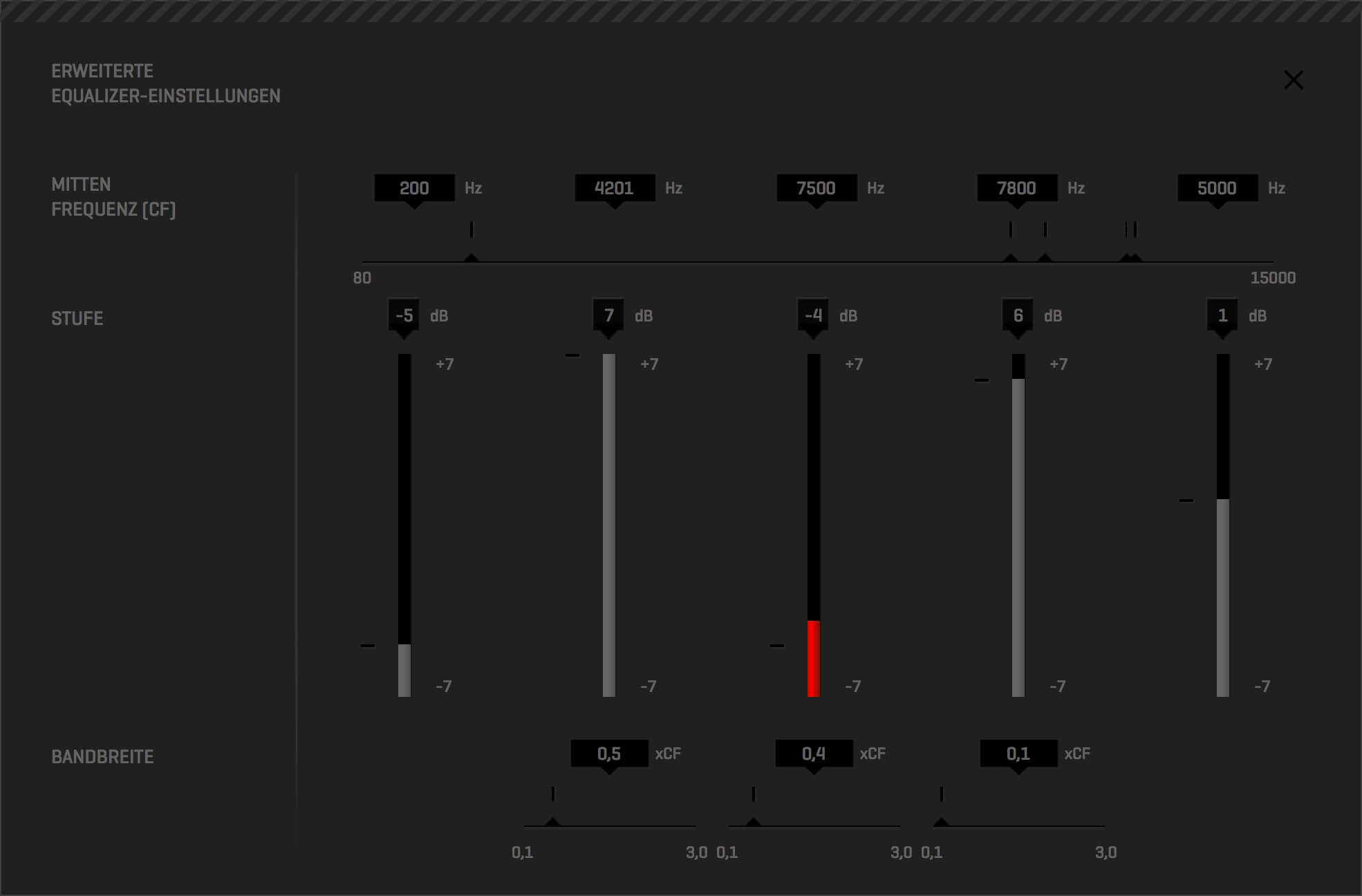 Ist die Verwaltungs-Software für Mac oder PC installiert, können Feineinstellungen in dem übersichtlichen Interface erfolgen: Unter „EQ-Einstellungen“ finden wir neben Presets wie „Media“ oder „Studio“ auch die Möglichkeit, die drei dauerhaft auf dem Kopfhörer gespeicherten Equalizer zu bearbeiten oder zu ändern. Der 5-Band-EQ kann sogar detailliert editiert werden. So lassen sich die Kennfrequenzen, die Lautstärke (-7 dB bis +7 dB) der einzelnen Bänder sowie die Steilheit der Crossover-Frequenz der drei Mittenbänder bearbeiten.