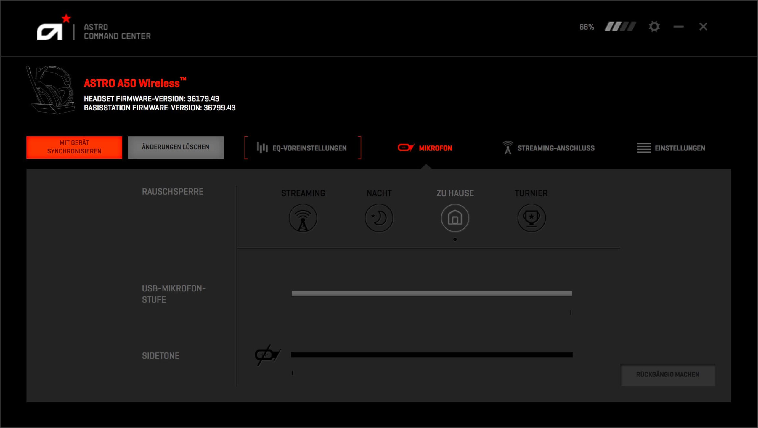 Im Bereich „Mikrofon“ stehen uns die vier Voreinstellungen „Streaming“, „Nacht“, „Zu Hause“ und „Turnier“ zur Verfügung. Erstere bietet ein moderat eingestelltes Noise Gate, das erst spät greift. Somit soll die Stimme bei ruhigen Umgebungen natürlich klingen, dafür werden Hintergrundgeräusche nur sehr spät und dezent unterdrückt. Das zweite Preset soll besonders für Gamer geeignet sein, die eher nachts spielen, da die Rauschsperre nur subtil arbeitet. „Zu Hause“ ist die Default-Einstellung des A50 und zielt u.a. auf kleine LAN-Partys ab, denn das Noise Gate greift hier früher zu als bei den beiden vorherigen Presets und entfernt die meisten geringfügigen Umgebungsgeräusche. Alle Turnier-Zocker mit Publikum im Hintergrund sollten sich auf das vierte und letzte Preset konzentrieren. Hier klingt die Stimme am unnatürlichsten, denn das Noise Gate packt früh zu und filtert sogar den Sidetone, damit jubelnde Fans nicht einstreuen. Ebenfalls lässt sich hier noch die Mikrofonempfindlichkeit einstellen sowie der Sidetone, also wie stark die eigene Stimme über das Headset gehört wird.