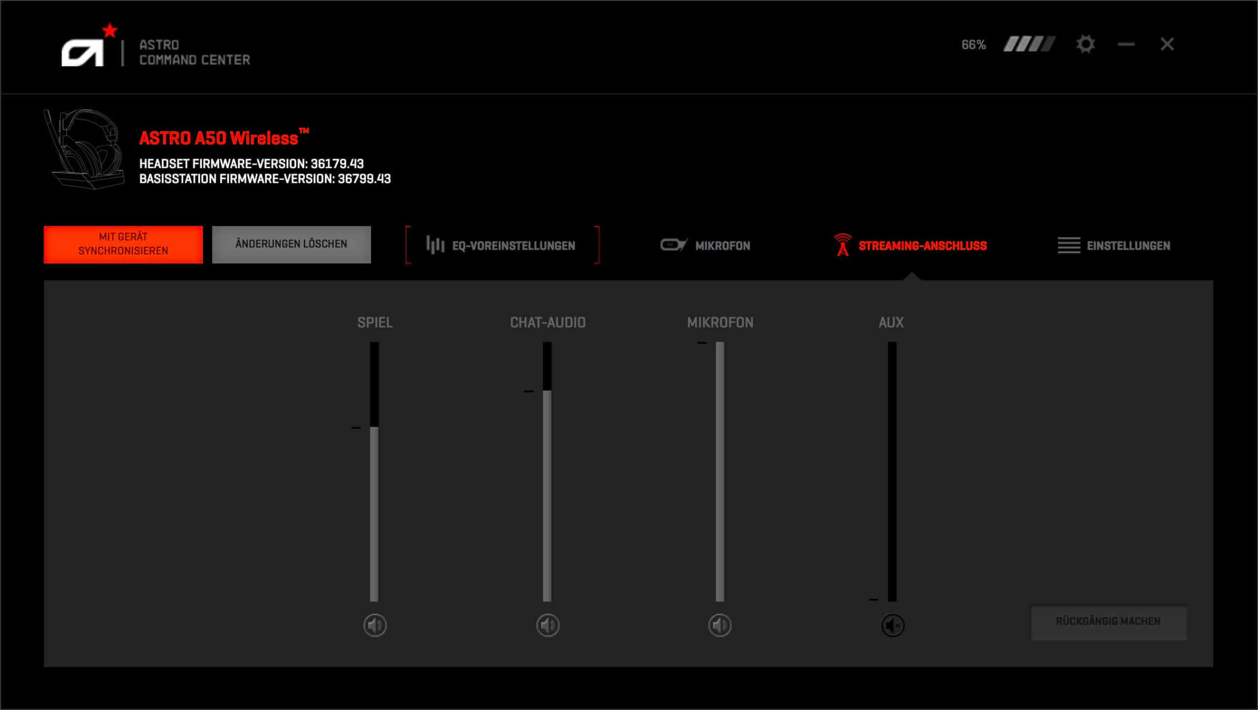 Wer als Streamer unterwegs ist, kann unter „Streaming-Anschluss“ seine vier Kanäle „Spiel“, „Chat-Audio“, „Mikrofon“ sowie „Aux“ in ein für ihn passendes Lautstärkeverhältnis setzen oder auch einzeln stummschalten.