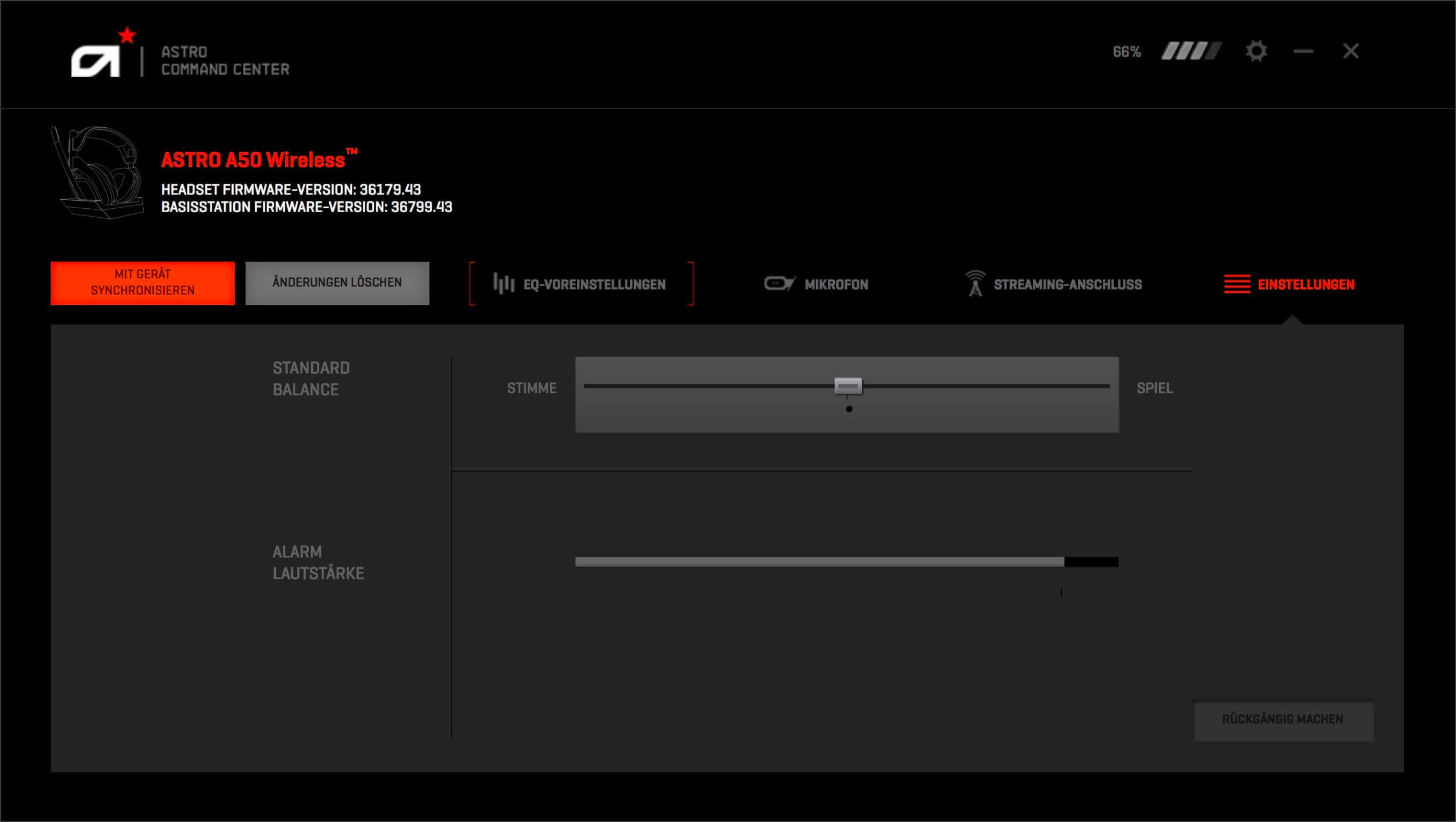 Abschließend lässt sich noch die Balance zwischen der eigenen Stimme und dem Game Sound, die Alarm-, bzw. die Benachrichtigungslautstärke einstellen sowie Firmware Updates aufspielen.