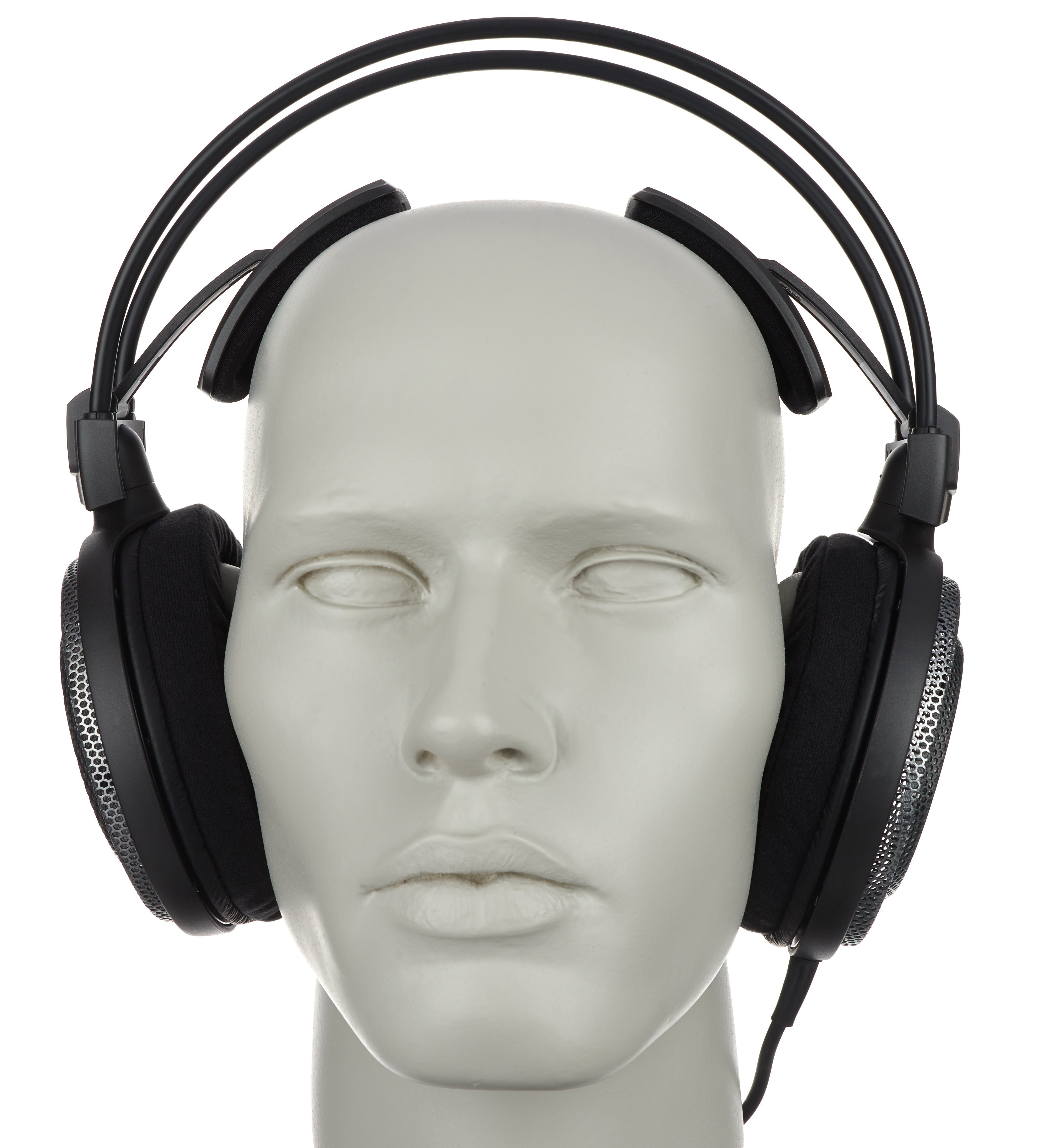 Für die leichte Konstruktion des ATH-AD700X hat Audio-Technica in die Trickkiste gegriffen. Die sehr spacigen Hörer-Seitenteile mit ihrer wabenartigen Struktur aus Metall fallen einem sofort ins Auge. Sie sind nicht nur ein Design-Gimmick im Industrial-Lochblechlook, sondern sie sparen ordentlich an Gewicht ein. Auch beim Bügel ist Leichtbauweise angesagt. Ein selbstjustierendes 3D-System passt sich hier automatisch an den Kopf an. Was übersetzt bedeutet, der Bügel geht nicht komplett über den Kopf, sondern setzt sanft mit zwei „Haarspangen“ auf. Für seine Größe empfinde ich den ATH-AD700X tatsächlich als extrem leicht. Durch das fehlende durchgehende Kopfband vermisst man aber den sicheren Halt bei Bewegungen. Eine Gratwanderung: Wer eher einen kleinen Kopfumfang hat, sollte testen, ob ihm dadurch der Sitz nicht zu locker ist. Bei den bequemen, ohrumschließenden Velours-Pads checkt man in der Hi-Fi-Business-Class ein. Die Kabelführung hat Audio-Technica ein wenig versteift, somit gibt’s keine Verwicklungs-Gefahr.
