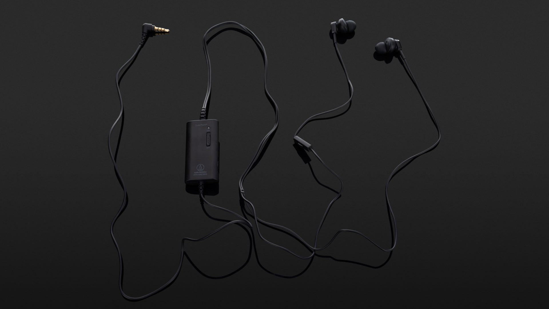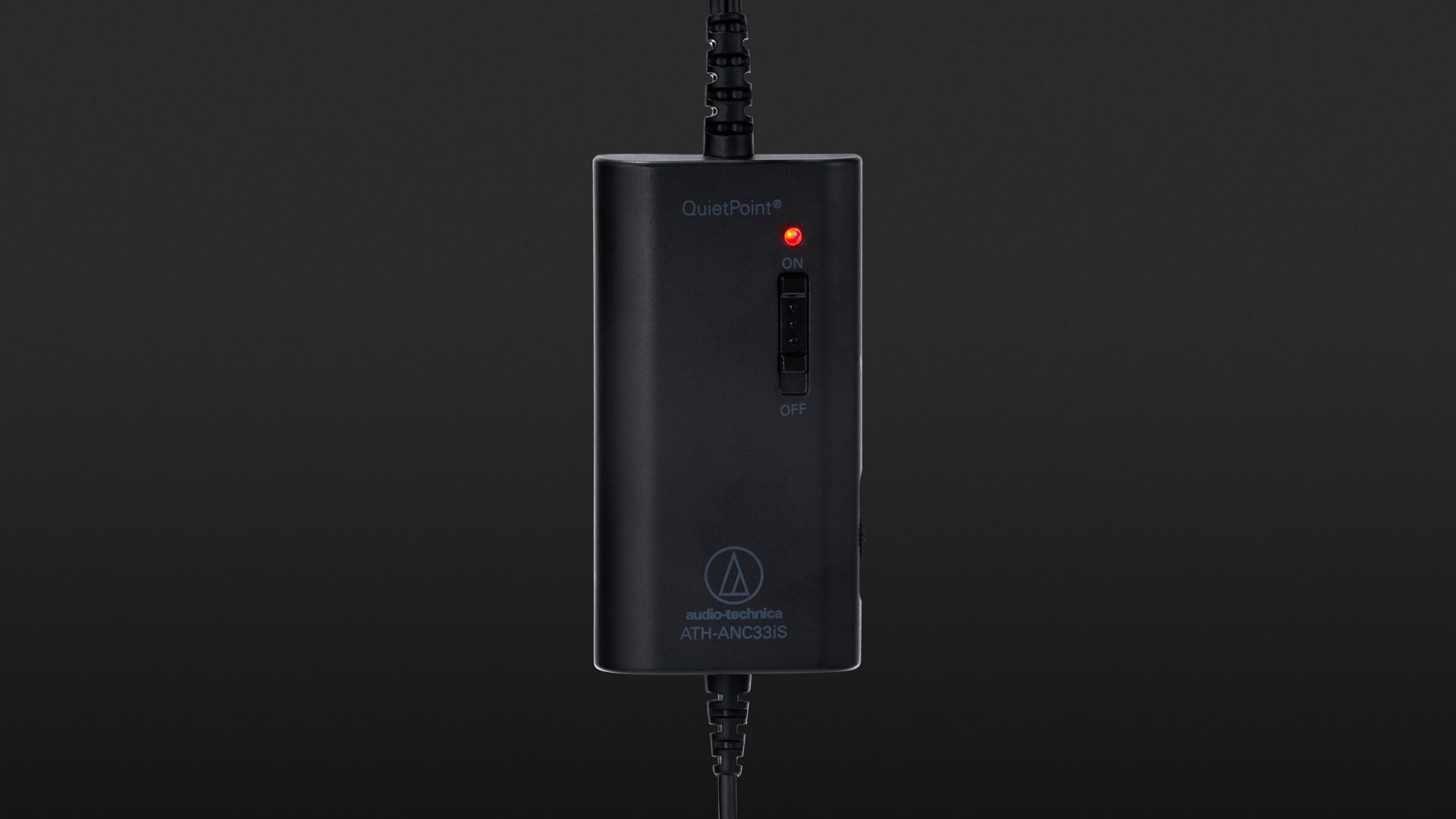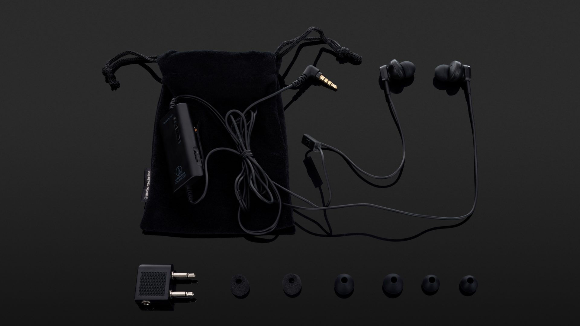 Der ATH-ANC33IS ist aus Kunststoff, wirkt aber nicht minderwertig. Zur Ausstattung gehören neben vier Ohrstöpseln (drei Größen Silikon plus einer aus Schaumstoff) ein Adapterstecker zum Anschluss an Unterhaltungssysteme im Flugzeug, der nur selten zur Grundausstattung gehört und ein Stoffsäckchen zur Aufbewahrung des Kopfhörers. Die aktive Elektronik zur Geräuschreduktion hängt am Kabel (1,40 Meter lang) und bietet einen Clip zur Befestigung an der Kleidung sowie ein Rädchen zum Einstellen der Lautstärke. Weiter oben am Kabel gibt es noch eine Ein-Tasten-Fernbedienung mit Mikrofon zum Steuern von Start/Stopp und dem Annehmen oder Auflegen von Telefongesprächen.