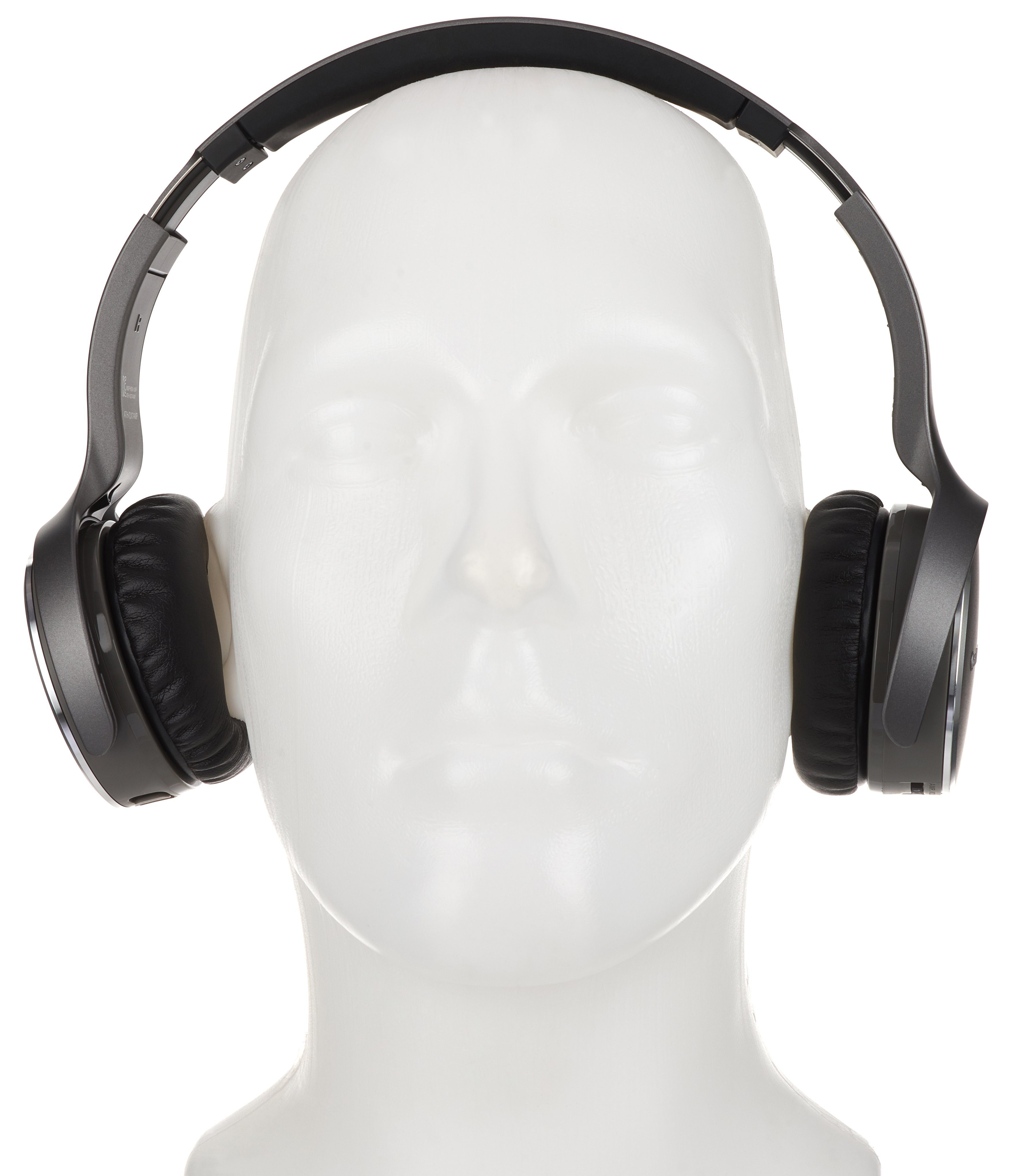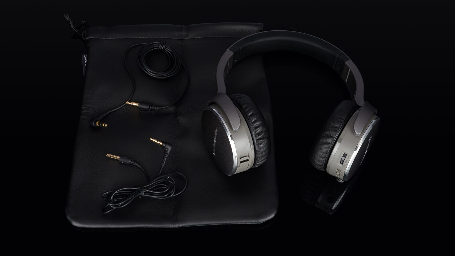 Die mittelgroßen Ohrmuscheln sind sehr weich gepolstert und der Kopfbügel ist mit einem weichen Kunstlederüberzug versehen. Die Bügel selbst haben zwar innen auch eine dünne Metallschicht, sind aber überwiegend aus Plastik. An der Unterseite des linken Ohrhörers sitzen der Ein/Aus-Schalter für den Verstärker und der dazugehörige Lautstärkeregler. Wenn man sich erst einmal an die Position gewöhnt hat, lassen sich diese Regler auch dann gut bedienen, wenn man den Kopfhörer aufgesetzt hat. Im anderen Ohrhörer steckt eine AAA-Batterie, die für die Stromversorgung des Verstärkers sorgt. Zur Verbindung mit dem MP3-Player werden zwei recht dünne, aber abnehmbare Kabel mitgeliefert (je 1,25 Meter lang): Das eine bietet eine Ein-Tasten-Fernbedienung und ein Mikrofon, das andere kommt ohne diese Ausstattungsmerkmale.