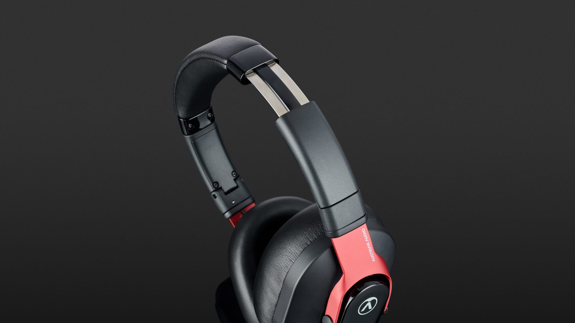 Das Äußere des ohrumschließenden und geschlossenen Austrian Audio Hi-X25BT ist nah am kleineren Bruder Hi-X15. Allerdings fehlen dem Hi-X25BT die silbernen Applikationen. Die entsprechenden Bauteile sind hier in Schwarz ausgeführt, identisch ist aber das auffällige Dunkelrot-Metallic seiner Gabeln. Dadurch sieht der Kopfhörer zugleich edel und zeitgemäß aus.