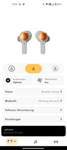 Zu den weiteren App-Funktionen zählen eine Player-Ansicht mit Wiedergabesteuerung, Titelnavigation und Lautstärkeeinstellung sowie eine Geräteverwaltung für die Multipoint-Verbindungen. Über die Anrufeinstellungen kann zudem wahlweise die Geräuschunterdrückung oder die Own Voice-Technologie aktiviert werden, jedoch ebenfalls ohne Intensitätsanpassung. Ansonsten sind noch Firmware-Aktualisierungen durchführbar, und zwar sowohl bei den Hörern als auch beim Lade-Case.