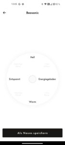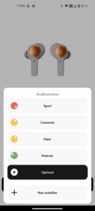 Zur Klangregelung dienen mit „Sport“, „Commute“, „Clear“ und „Podcast“ vier Voreinstellungen, die den Grundklang ergänzen. Außerdem können über die Beosonic-Funktion eigene Anpassungen vorgenommen werden, die speicherbar sind.