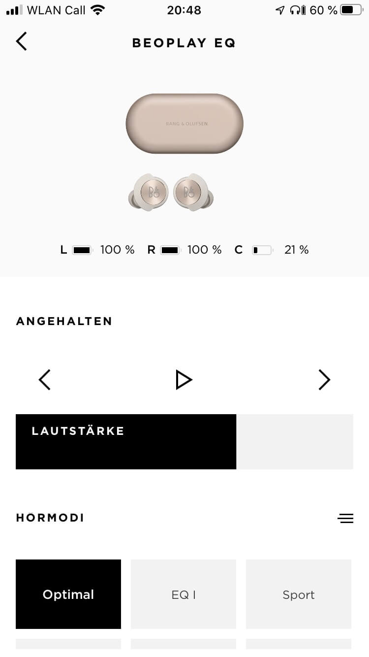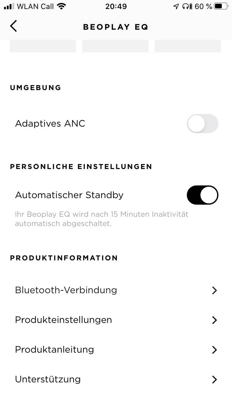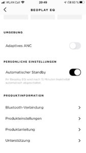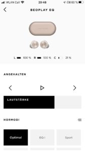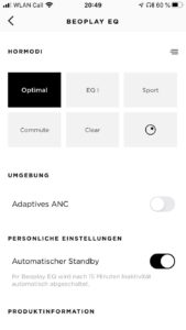 Neben der Abschaltautomatik, dem Aktivieren des Pairing-Modus und der Möglichkeit von Firmware-Updates bietet die B&O-App zudem Optionen zur Klanganpassung der Hörer. Hierzu stehen sechs vorkonfigurierte Presets wie „Podcast“, „Sport“ oder „Commute“ zur Auswahl, während mithilfe der Beosonic-Funktion eigene Einstellungen vorgenommen werden können. Diese sind auch speicherbar, wobei hierdurch die zur Verfügung gestellten Presets überschrieben werden, was nicht gut gelöst ist. Zumal die Personalisierungsmöglichkeiten der Beoplay EQ über die App als durchaus ausbaufähig erscheinen, da zum Beispiel eine Anpassung der Touch-Steuerung im unteren und mittleren Preissegment quasi zum Standardrepertoire zählt. Auch eine Rückmeldung, ob der ANC-, Transparenz- oder Grundmodus aktiv ist, kann vermisst werden. In der momentanen App-Version ist ausschließlich das Ein- und Ausschalten des adaptiven Noise Cancellings möglich.