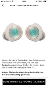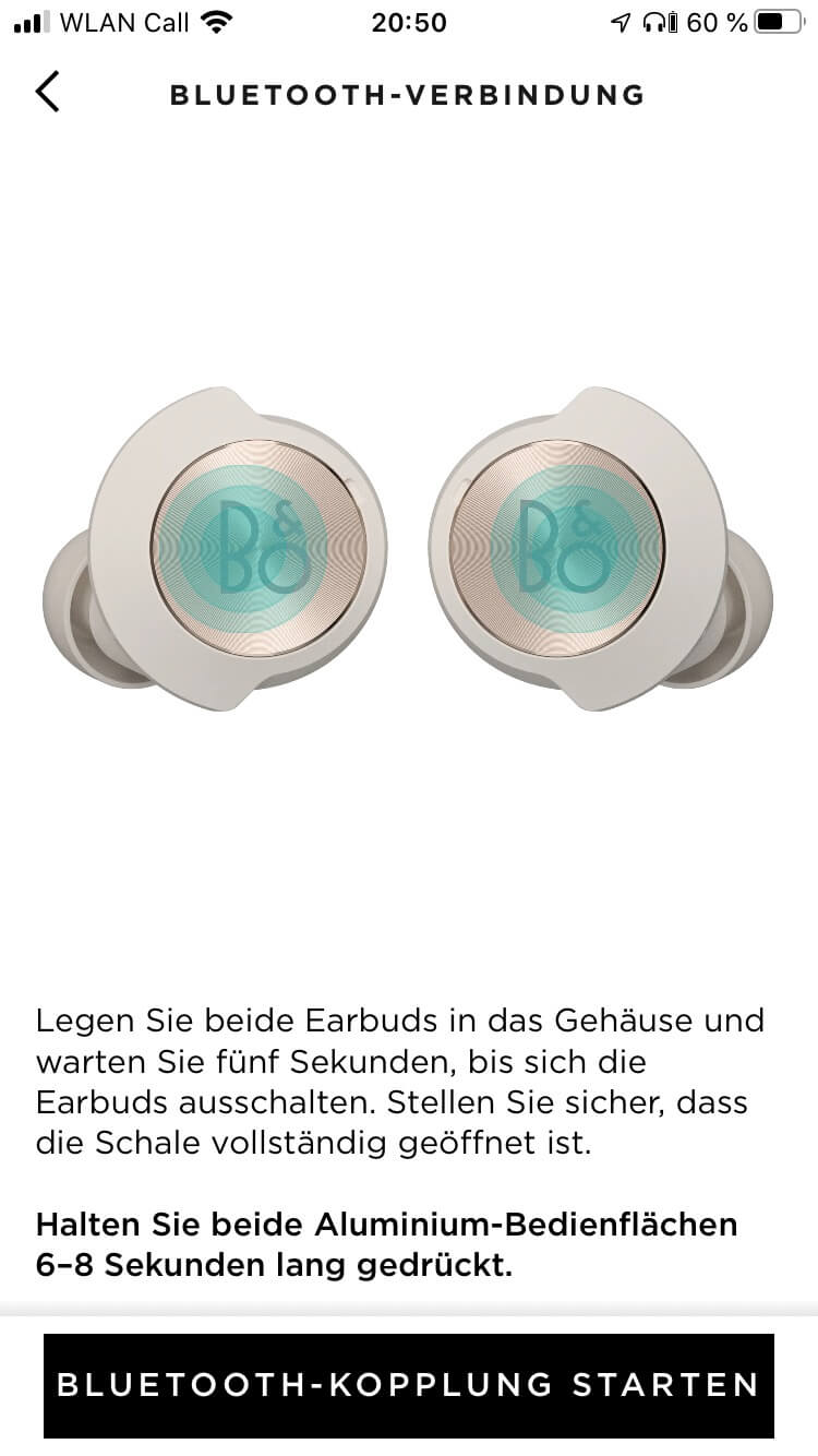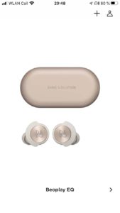 Bei der Inbetriebnahme kann das Koppeln der Wireless-Hörer, die den Bluetooth-Standard 5.2 und eine einseitige Nutzung im Single-Modus unterstützen, mit der Entnahme aus dem Case erfolgen, da die Beoplay EQ automatisch eingeschaltet und in den Pairing-Modus versetzt werden. Das funktioniert jedoch nicht, sobald ein weiteres Gerät ins Spiel kommt. Wenn alternativ zum Smartphone eine Funkverbindung zum Tablet hergestellt werden soll, wird das Prozedere etwas umständlich, da der Pairing-Modus nur über die App oder über die in der Ladevorrichtung liegenden Hörer aktivierbar ist, indem die Touch-Oberflächen mehrere Sekunden gehalten werden. Als Manko kann darüber hinaus betrachtet werden, dass die Hörer nicht manuell ein- und ausgeschaltet werden können, da mit dem Zurücklegen in das Case ein ständiges Laden der In-Ears verbunden ist, was sich negativ auf die Lebensdauer der Akkus auswirkt. Als Workaround ist zwar ein Timer nutzbar, der per App aktiviert werden kann und die Hörer nach 15 Minuten Inaktivität abschaltet. Allerdings wäre es bei dieser Behelfslösung nützlich, wenn der Zeitabstand der Abschaltung ausgewählt werden könnte.