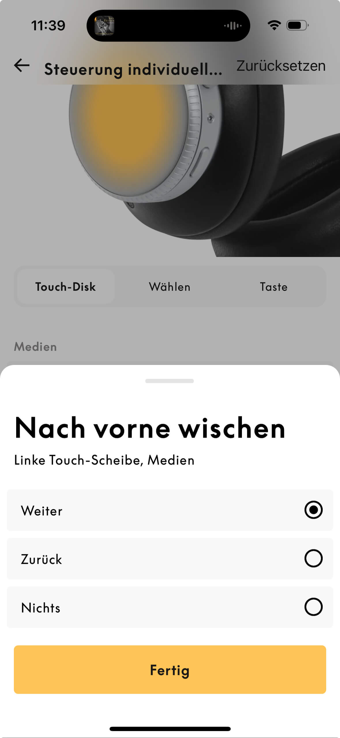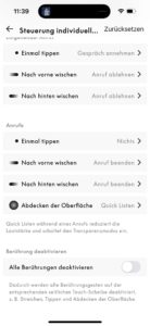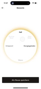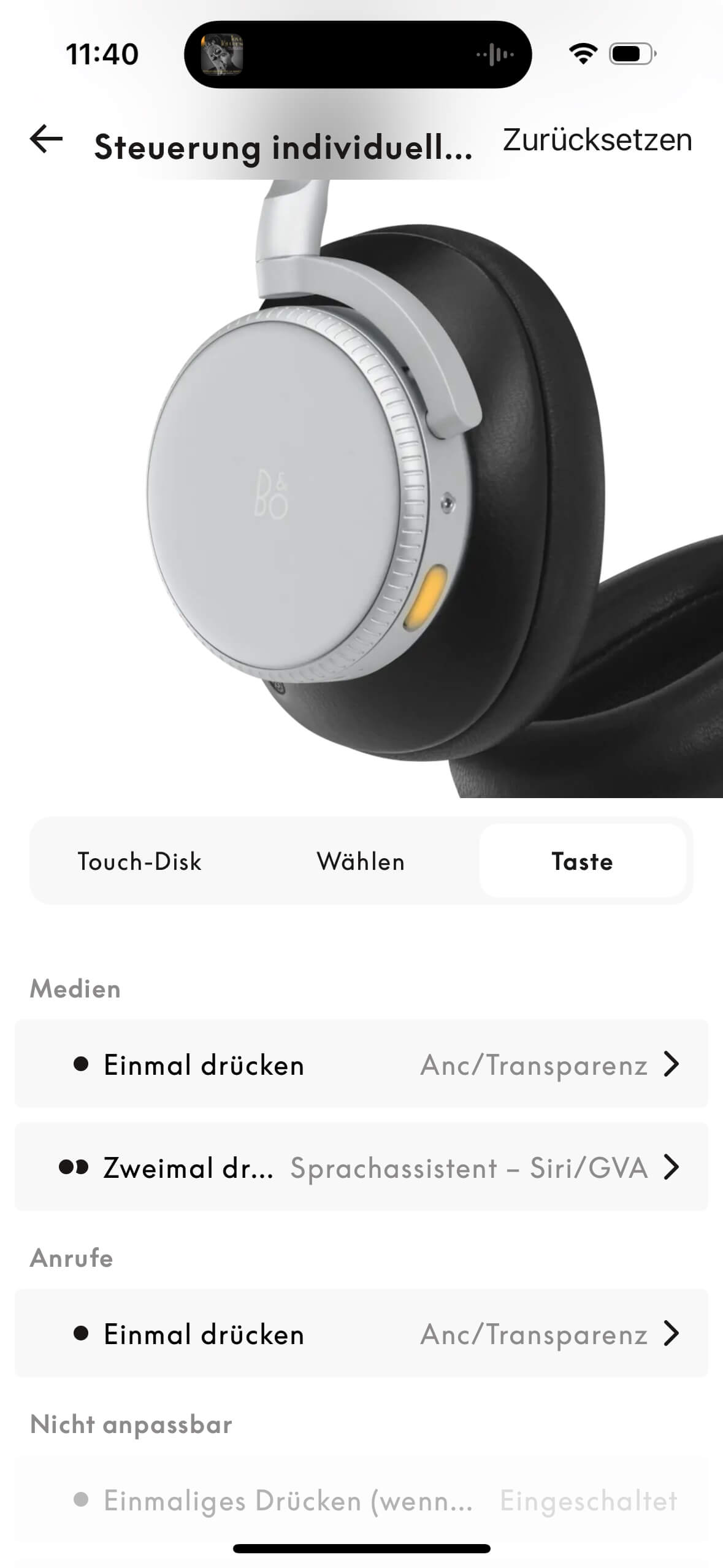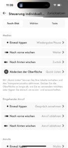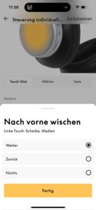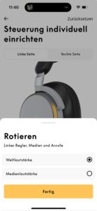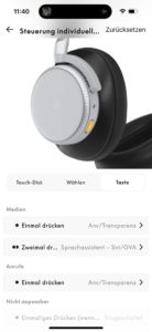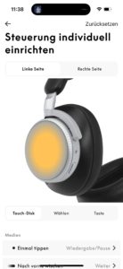 Auf beiden Unterseiten gibt es je einen gut ertastbaren, rechteckigen „Knopf“, der zwischen ANC- und Transparenzmodus hin- und herschaltet, aber auch beim Bluetooth-Pairing Dienste leistet. Die gläsernen Touch-Flächen beider Seiten sind für Wischgesten offen und umfänglich individuell einzurichten. Die Screenshots aus der Beoplay-App verdeutlichen, wie groß hier das Angebot ist, die Bedienung des Beoplay H100 nach eigenem Gusto zu gestalten. Der Transparenzmodus wird in der App charmanterweise als „Weltlautstärke“, im Englischen „World Volume“ bezeichnet.