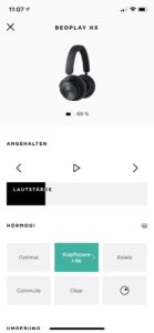Was immer wieder mal nicht funktionierte, war die Lautstärkeregelung durch Wischgesten. Das kreisförmige Wischen auf der rechten Hörmuschel, im Uhrzeigersinn zum Erhöhen und gegen den Uhrzeigersinn zum Verringern, hat allzu häufig nicht zum Erfolg geführt. Hier setze ich einfach mal darauf, dass Firmware-Updates Besserung bringen, denn die Beoplay-Vorgänger konnten das ja auch. Musik stoppen oder Gespräche annehmen per Fingertip auf die Mitte der rechten HX-Außenhaut klappte nach spürbarer Verzögerung und entsprechender Eingewöhnung zuverlässig.