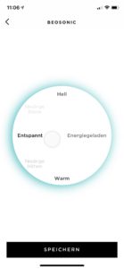 Ist der HX angemeldet, bietet die App verschiedene Hörmodi. Es handelt sich hier um Klangattribute, die man durch Bewegen eines Punktes im Kreis zwischen „Hell“, „Entspannt“, „Warm“ und „Energiegeladen“ selbst bestimmen kann. So lassen sich Hörprofile erstellen und auch unter eigenem Namen abspeichern.
