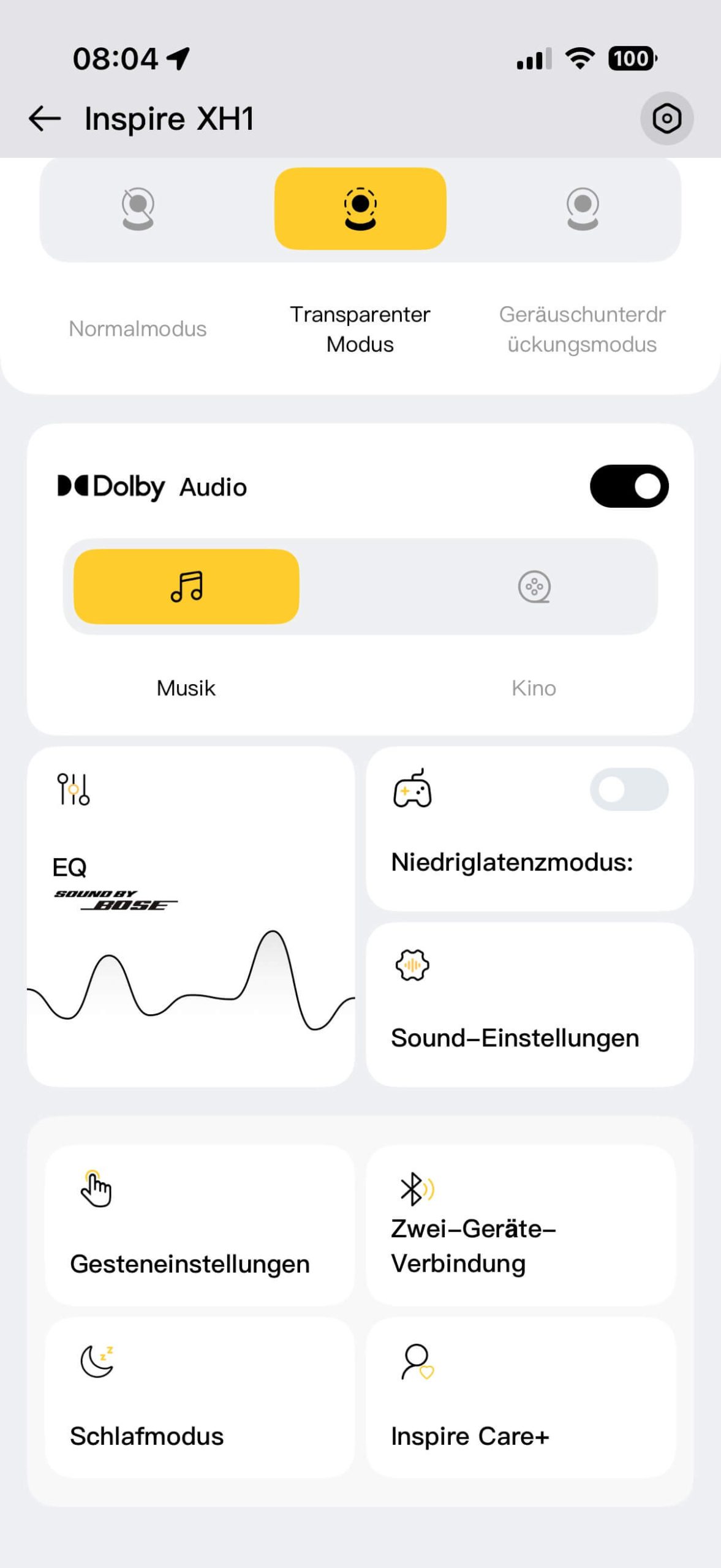 Das aktive Noise Cancelling des Inspire XH1 arbeitet zuverlässig, aber nicht perfekt. Tieffrequente Geräusche wie Motoren oder Zugrollen werden wirkungsvoll unterdrückt, während höhere Frequenzen – etwa Stimmen – noch leicht durchdringen. Für Büro, Bahn und Alltag reicht die Leistung völlig aus, doch die besten ANC-Modelle am Markt spielen hier eine Klasse darüber.
